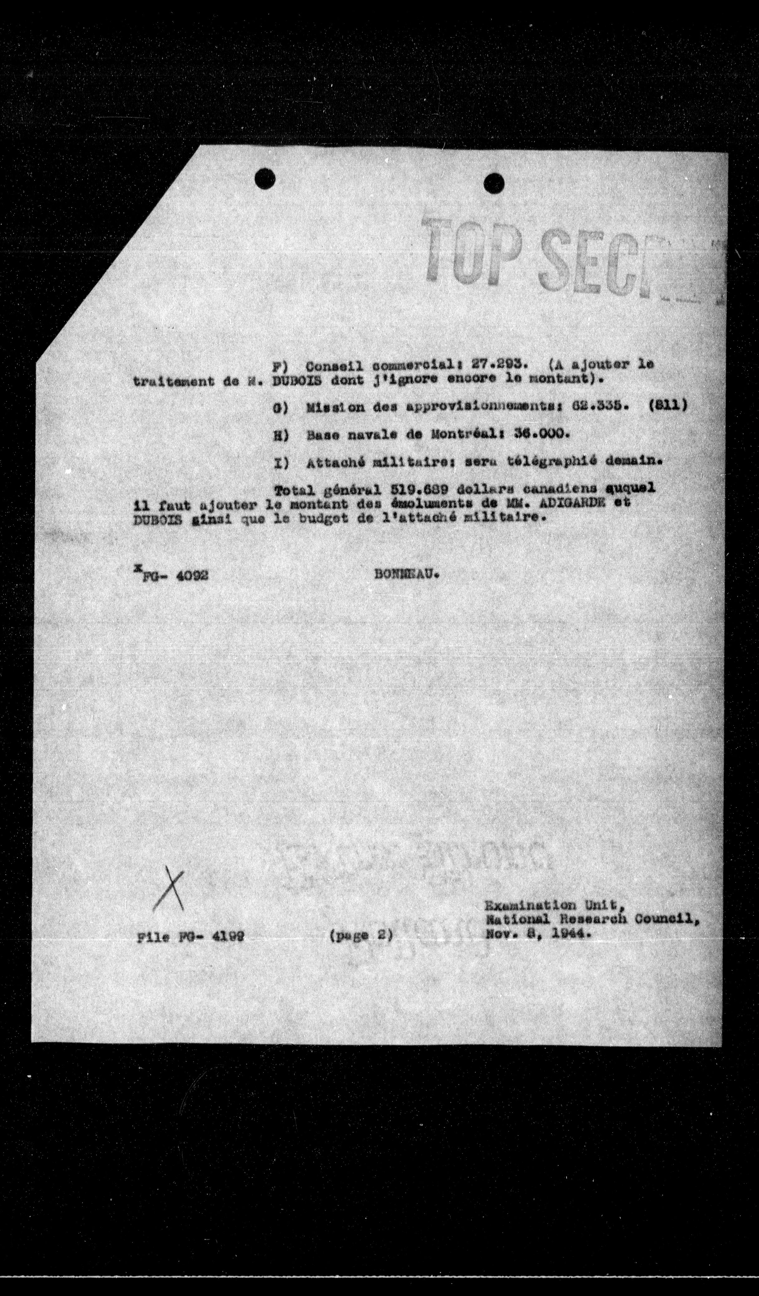 Total général 519.689 dollars canadiens auquel il faut ajouter le montant des émoluments de MM. ADJOURDE et DUBOIS ainsi que le budget de l'attaché militaire.