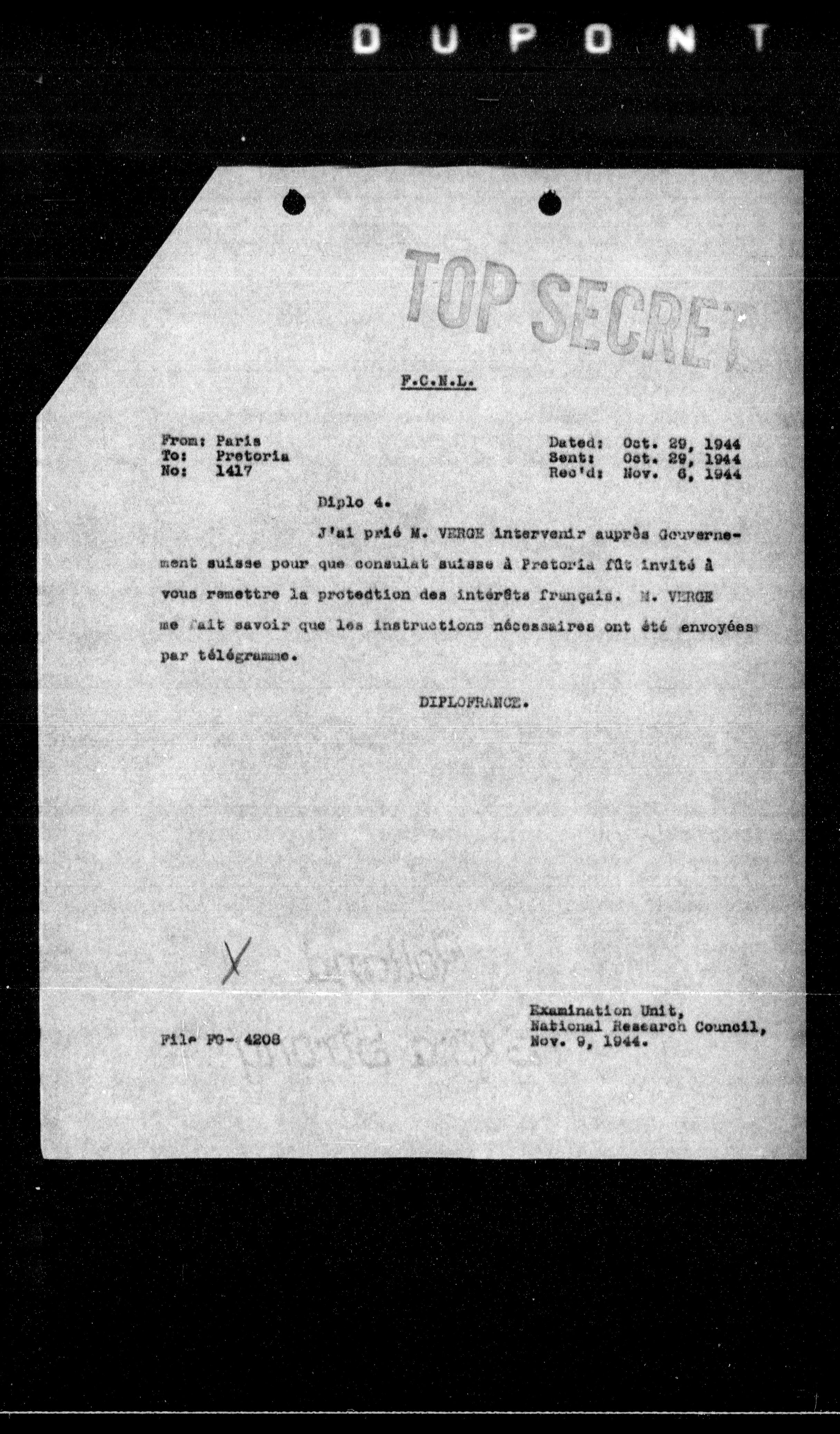 **From:** Paris **To:** **Pretoria** **No:** 1417