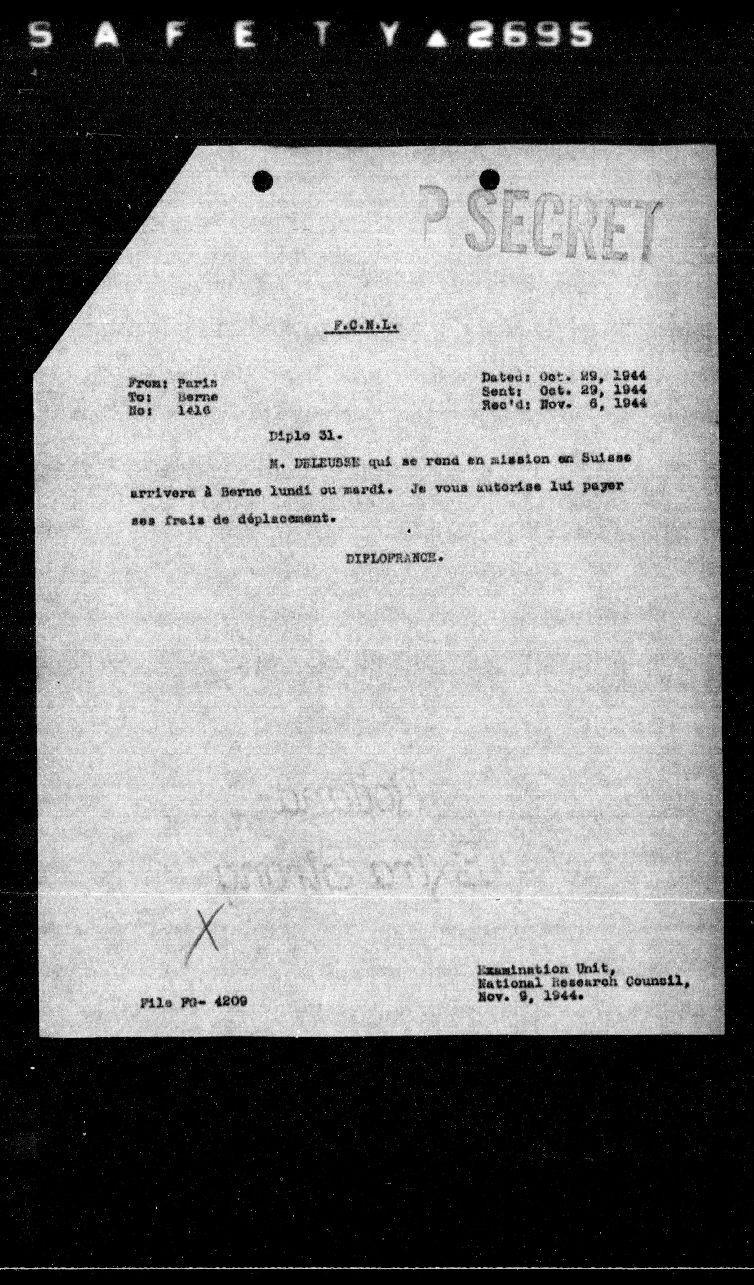 M. DELEUSSE qui se rend en mission en Suisse arrivera à Berne lundi ou mardi. Je vous autorise lui payer ses frais de déplacement.