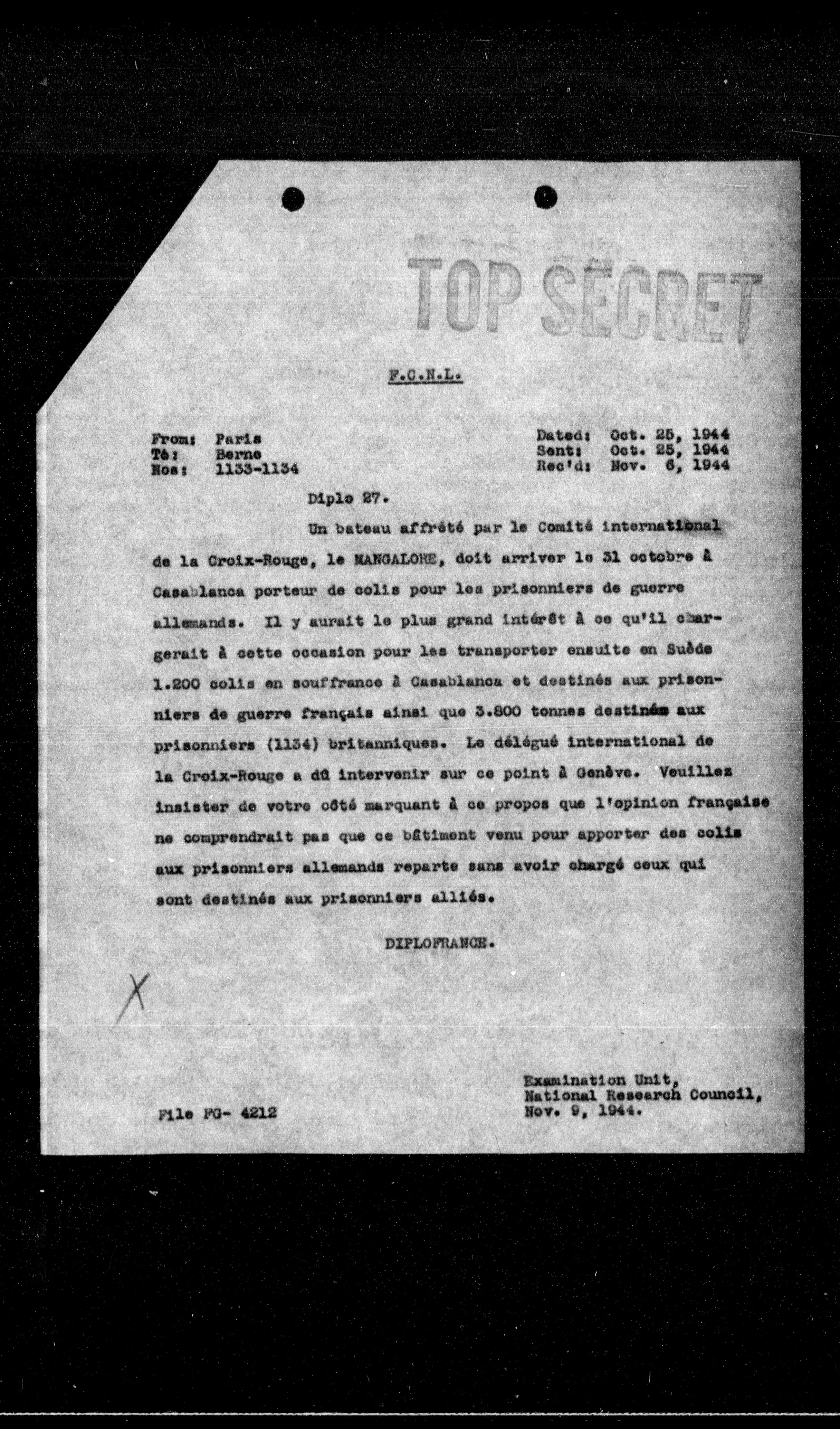 Un bateau affrété par le Comité international de la Croix-Rouge, le NANGALORE, doit arriver le 31 octobre à Casablanca porteur de colis pour les prisonniers de guerre allemands. Il y aurait le plus grand intérêt à ce qu'il chargerait à cette occasion pour les transporter ensuite en Suède 1.200 colis en souffrance à Casablanca et destinés aux prisonniers de guerre français ainsi que 3.800 tonnes destinés aux prisonniers (1134) britanniques. Le délégué international de la Croix-Rouge a dû intervenir sur ce point à Genève. Veuillez insister de votre côté marquant à ce propos que l'opinion française ne comprendrait pas que ce bâtiment venu pour apporter des colis aux prisonniers allemands reparte sans avoir chargé ceux qui sont destinés aux prisonniers alliés.