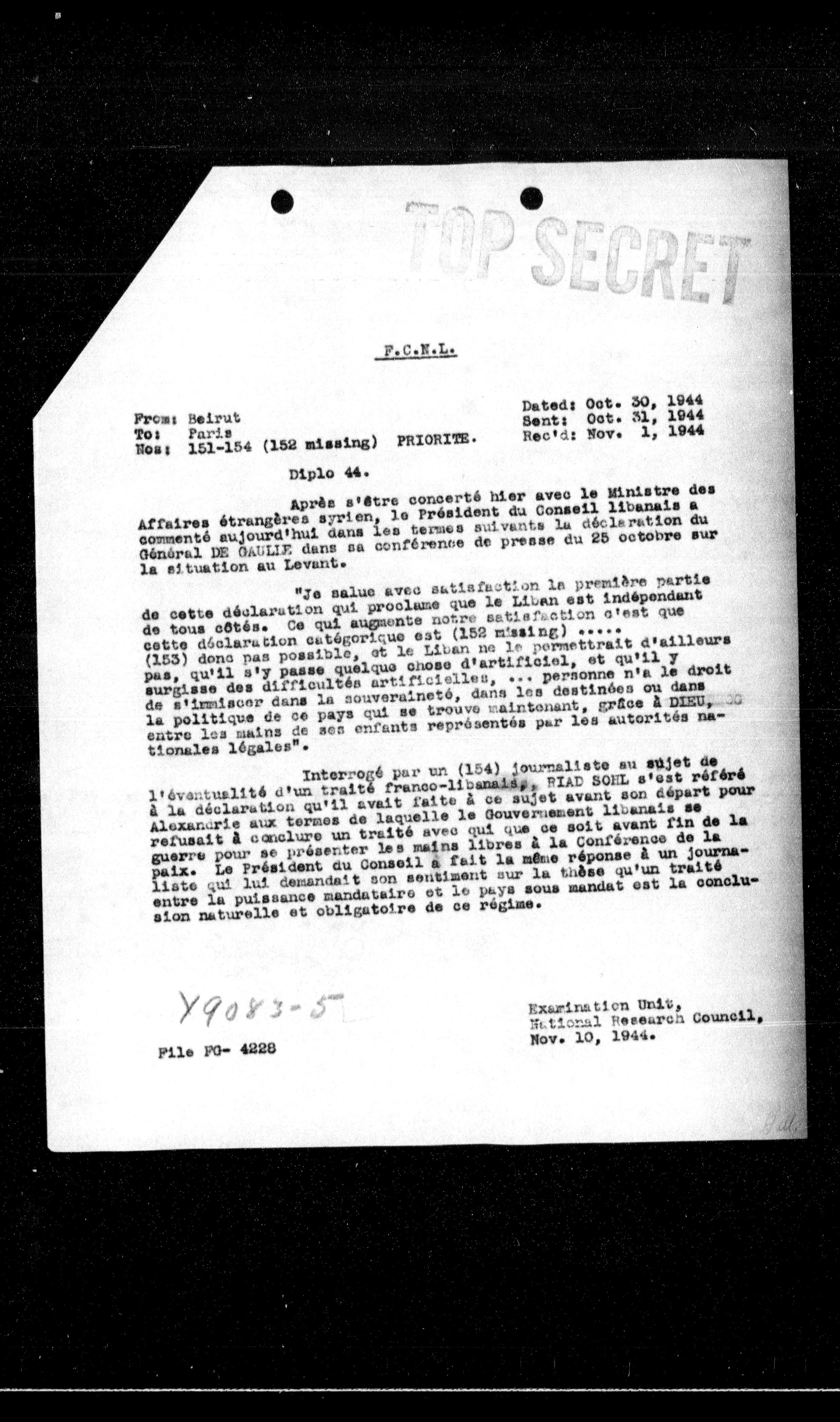 "Je salue avec satisfaction le première partie de cette déclaration qui proclame que le Liban est indépendant de tous côtés. Ce qui augmente notre satisfaction c'est que cette déclaration catégorique est (152 missing) (153) donc pas possible, et le Liban ne le permettrait d'ailleurs pas, qu'il s'y passe quelque chose d'artificiel, et qu'il y surgisse des difficultés artificielles, ... personne n'a le droit de s'imposer dans la souveraineté, dans les destinées ou dans la politique de ce pays qui se trouve maintenant, grâce à DIEG, entre les mains de ses enfants représentés par les autorités nationales légales".