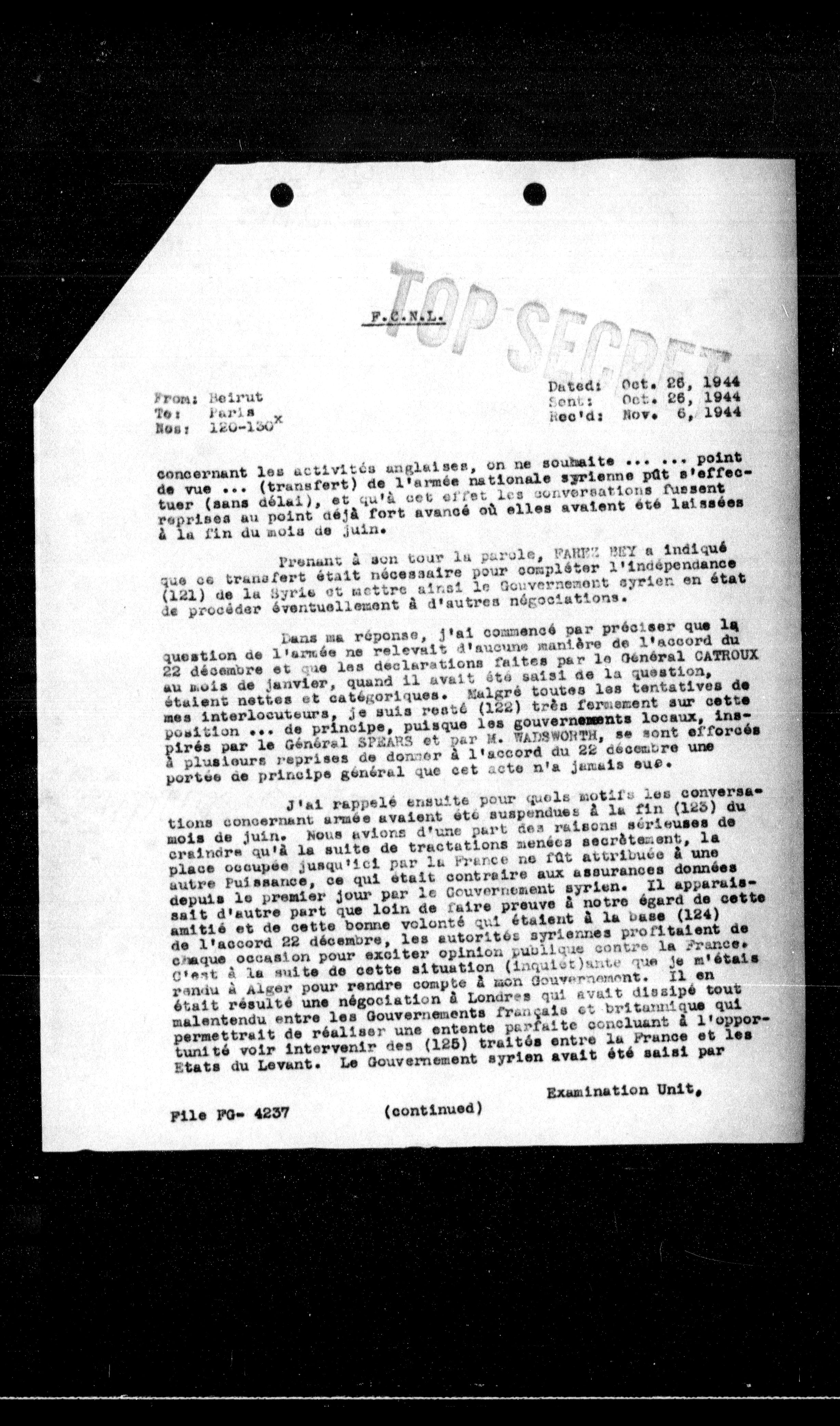 Dans ma réponse, j'ai commencé par préciser que la question de l'armée ne relevait d'aucune manière de l'accord du 22 décembre et que les déclarations faites par le Général CATROUX au mois de janvier, quand il avait été saisi de la question, étaient nettes et catégoriques. Malgré toutes les tentatives de mes interlocuteurs, je suis resté (122) très fermement sur cette position ... de principe, puisque les gouvernements locaux, inspirés par le Général SPEARS et par M. WAMBURGST, se sont efforcés à plusieurs reprises de donner à l'accord du 22 décembre une portée de principe général que cet acte n'a jamais sué.