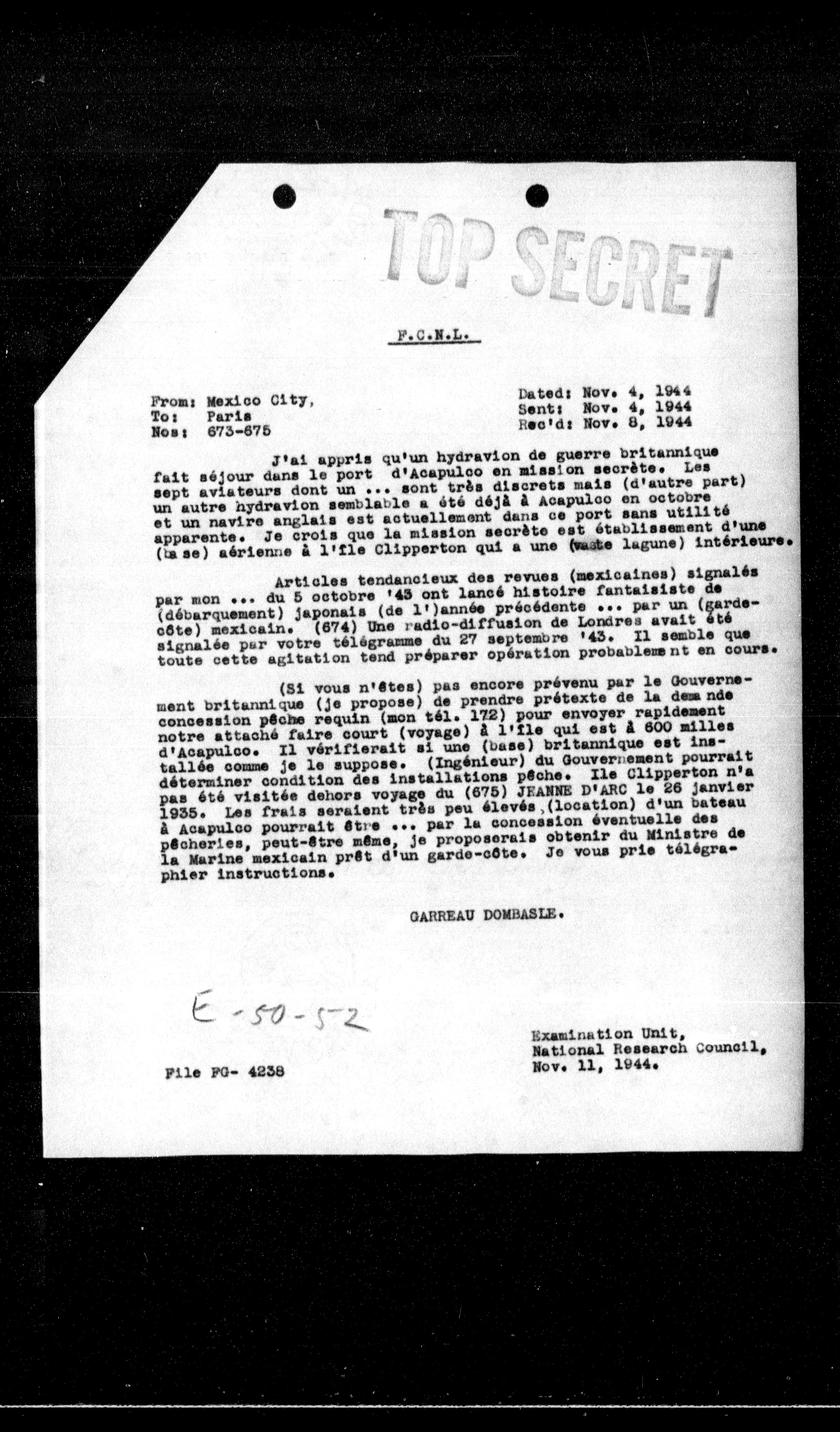 J'ai appris qu'un hydravion de guerre britannique fait séjour dans le port d'Acapulco en mission secrète. Les sept aviateurs dont un sont très discrets mais (d'autre part) un autre hydravion semblable a été déjà à Acapulco en octobre et un navire anglais est actuellement dans ce port sans utilité apparente. Je crois que la mission secrète est établissement d'une (la se) aérienne à l'île Clipperton qui a une (toute lagune) intérieure.