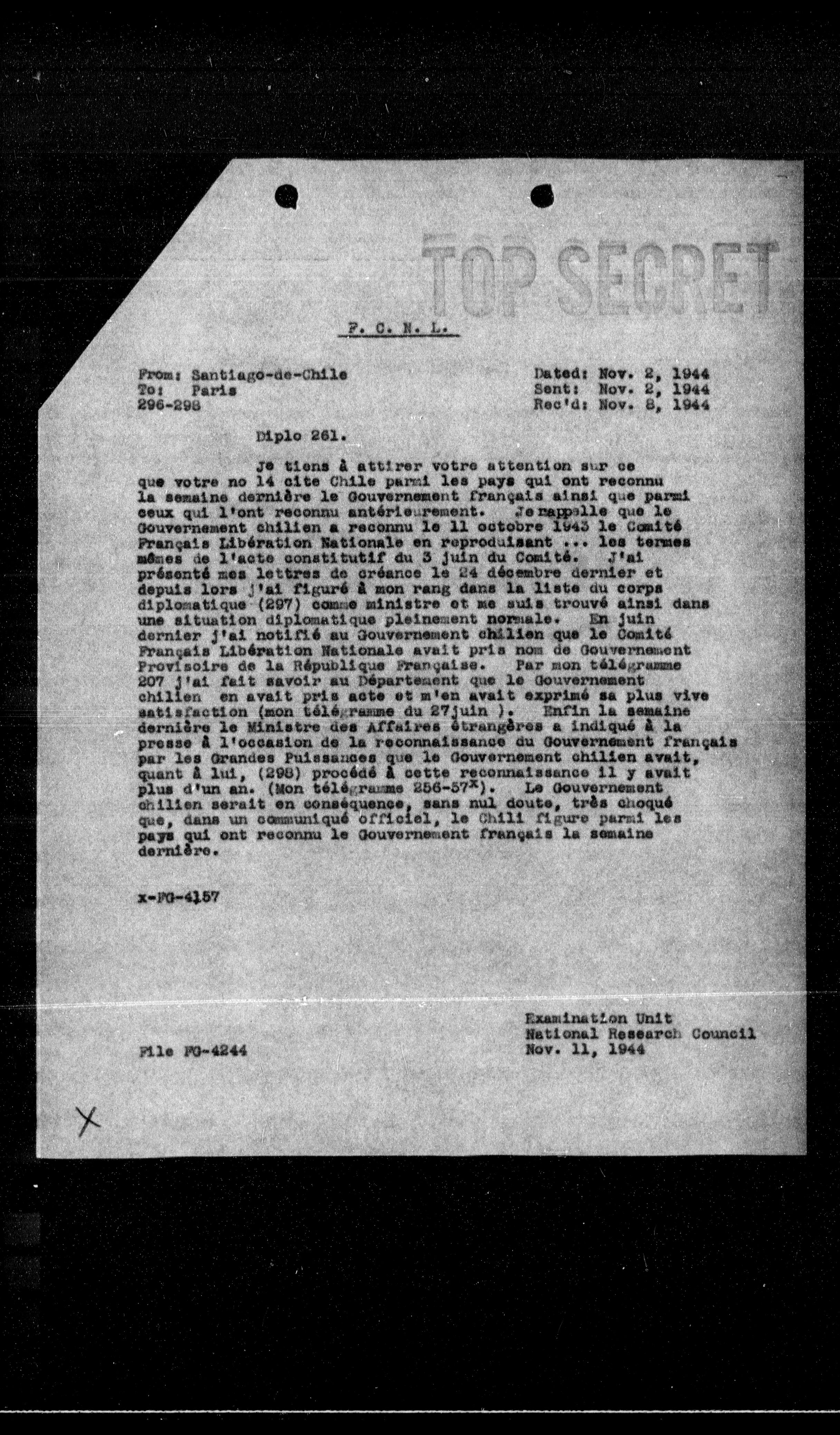 Je tiens à attirer votre attention sur ce que votre no 14 dite Chile parmi les pays qui ont reconnu la semaine dernière le Gouvernement français ainsi que parmi ceux qui l'ont reconnu antérieurement. Je rappelle que le Gouvernement chilien a reconnu le 11 octobre 1943 le Comité Français Libération Nationale en reproduisant ... les termes mêmes de l'acte constitutif du 3 juin du Comité. J'ai présenté mes lettres de créance le 24 décembre dernier et depuis lors j'ai figuré à mon rang dans la liste du corps diplomatique (207) comme ministre et me suis trouvé ainsi dans une situation diplomatique pleinement normale. En juin dernier j'ai notifié au Gouvernement chilien que le Comité Français Libération Nationale avait pris nom de Gouvernement Provisoire de la République Française. Par mon télégramme 207 j'ai fait savoir au Département que le Gouvernement chilien en avait pris acte et m'en avait exprimé sa plus vive satisfaction (mon télégramme du 27 juin). Enfin la semaine dernière le Ministre des Affaires étrangères a indiqué à la presse à l'occasion de la reconnaissance du Gouvernement français par les Grandes Puissances que le Gouvernement chilien avait, quant à lui, (298) procédé à cette reconnaissance il y avait plus d'un an. (Mon télégramme 256-573). Le Gouvernement chilien serait en conséquence, sans nul doute, très choqué que, dans un communiqué officiel, le Chili figure parmi les pays qui ont reconnu le Gouvernement français la semaine dernière.