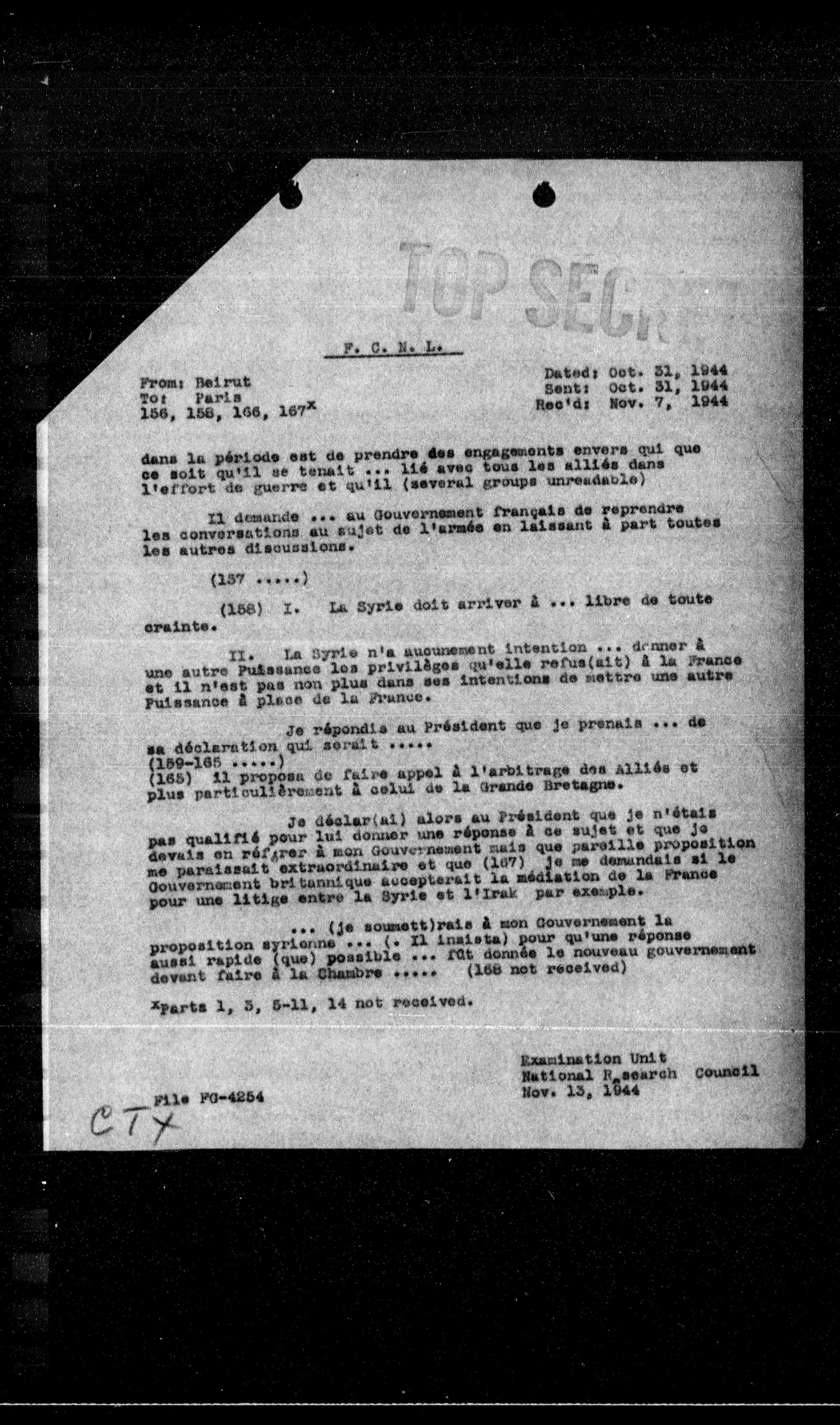 (Je soumets) mais à mon Gouvernement la proposition syrienne ... (Il insista) pour qu'une réponse aussi rapide (que) possible ... fût donnée le nouveau gouvernement devant faire à la Chambre (168 not received)