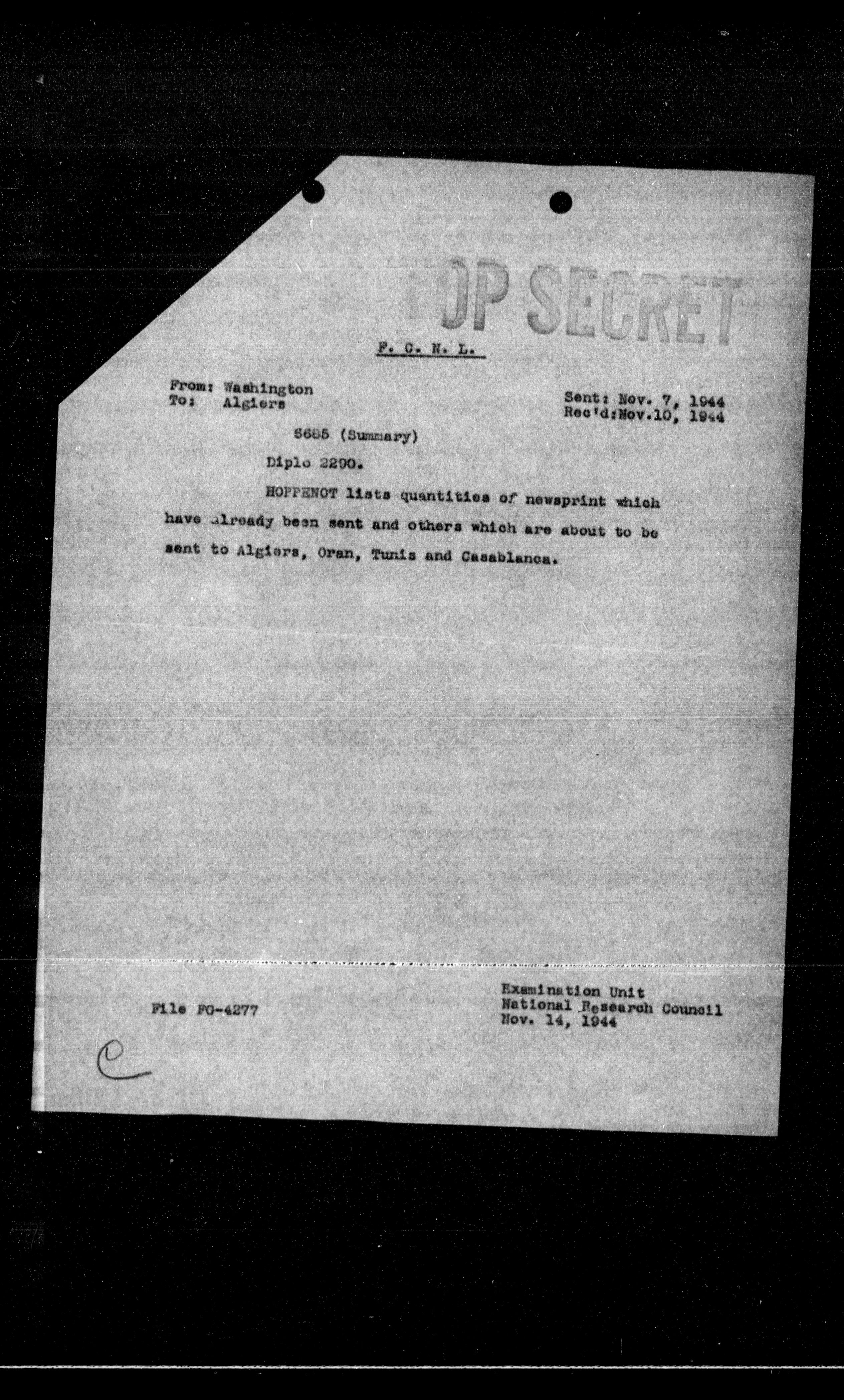 HOPPENOT lists quantities of newsprint which have already been sent and others which are about to be sent to Algiers, Oren, Tuniz and Casablanca.