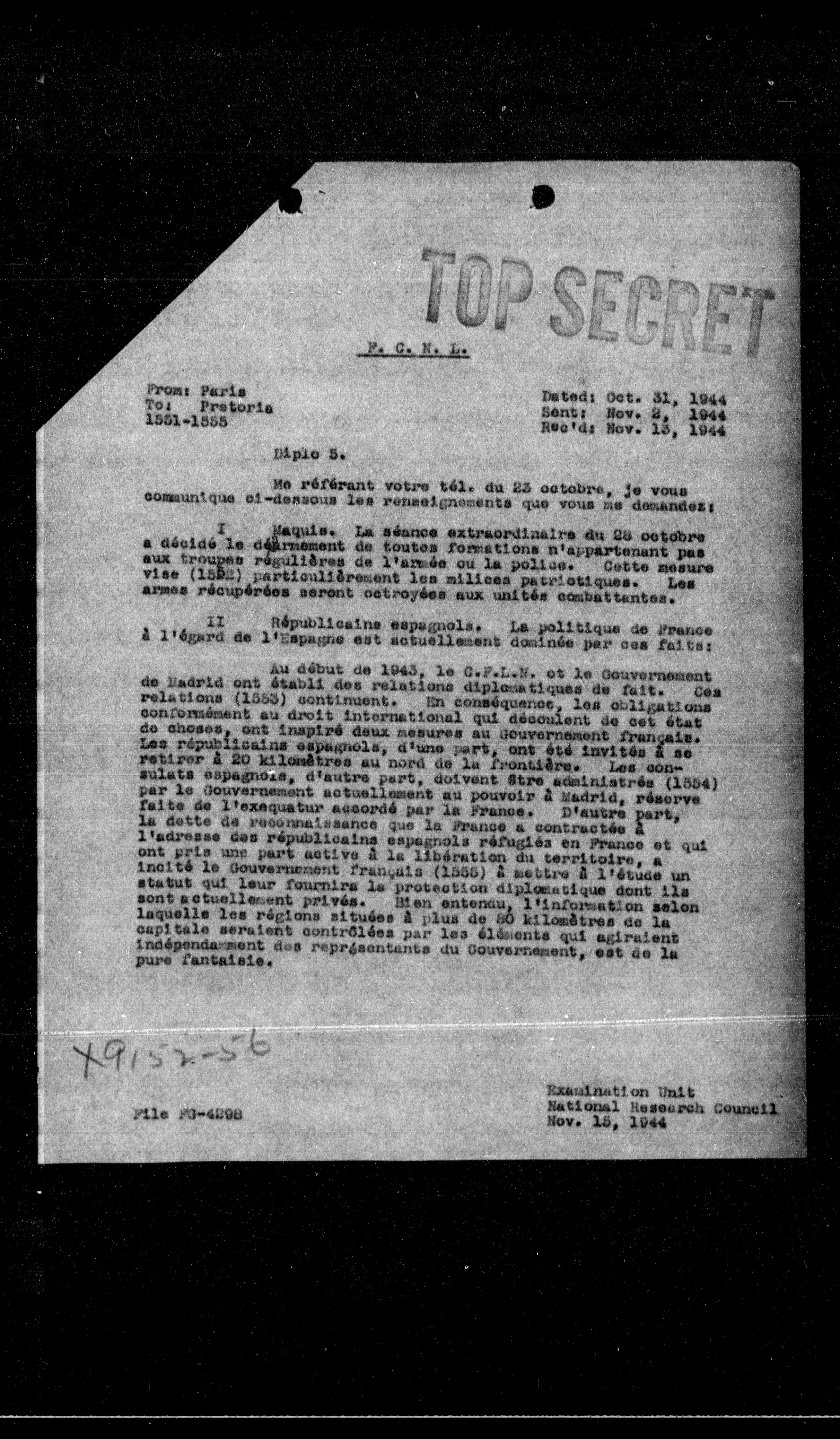 Au début de 1943, le G.F.L.N. et le Gouvernement de Madrid ont établi des relations diplomatiques de fait. Ces relations (1553) continuent. En conséquence, les obligations conformément au droit international qui découlent de cet état de choses, ont inspiré deux mesures au Gouvernement français. Les républicains espagnols, d'une part, ont été invités à se retirer à 20 kilomètres au nord de la frontière. Les consulats espagnols, d'autre part, doivent être administrés (1554) par le Gouvernement actuellement au pouvoir à Madrid, réserve faite de l'exequatur accordé par la France. D'autre part, la dette de reconnaissance que la France a contractée à l'adresse des républicains espagnols réfugiés en France et qui ont pris une part active à la libération du territoire, a incité le Gouvernement français (1555) à mettre à l'étude un statut qui leur fournira la protection diplomatique dont ils sont actuellement privés. Bien entendu, l'information selon laquelle les régions situées à plus de 80 kilomètres de la capitale seraient contrôlées par les éléments qui agiraient indépendamment des représentants du Gouvernement, est de la pure fantaisie.