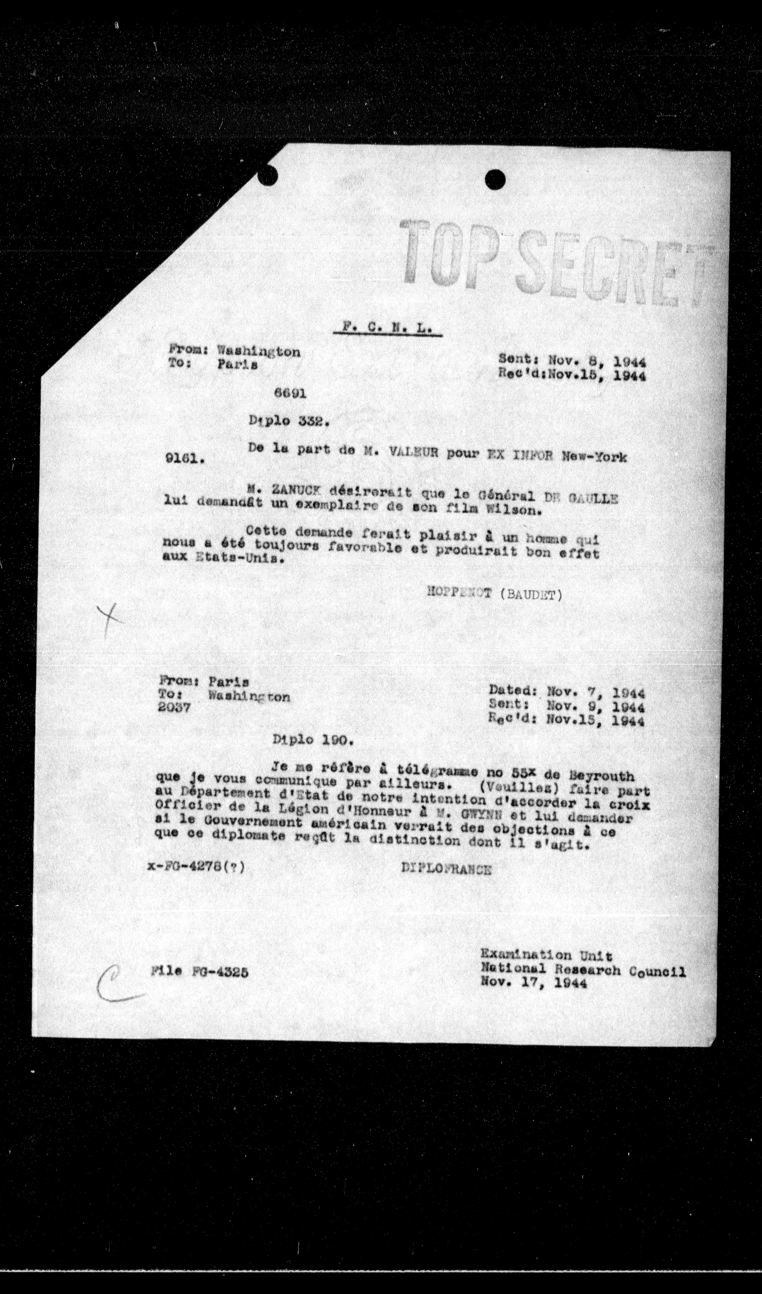 M. ZANUCK désirerait que le Général DE GAULLE lui demandait un exemplaire de son film Wilson.