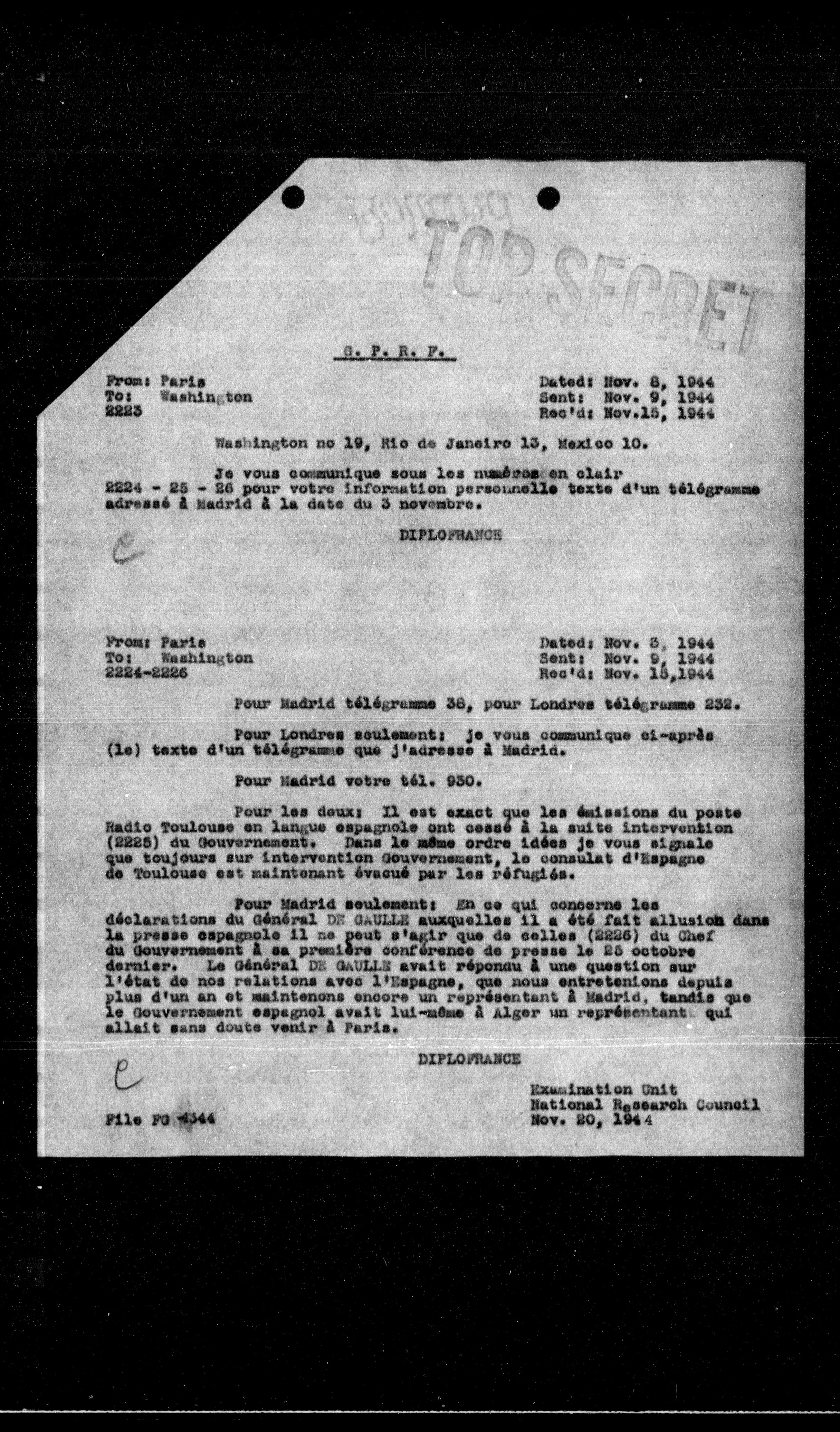 **From:** Paris **To:** Washington **Date:** Nov. 8, 1944 **Date:** Nov. 9, 1944 **Rec'd:** Nov. 15, 1944