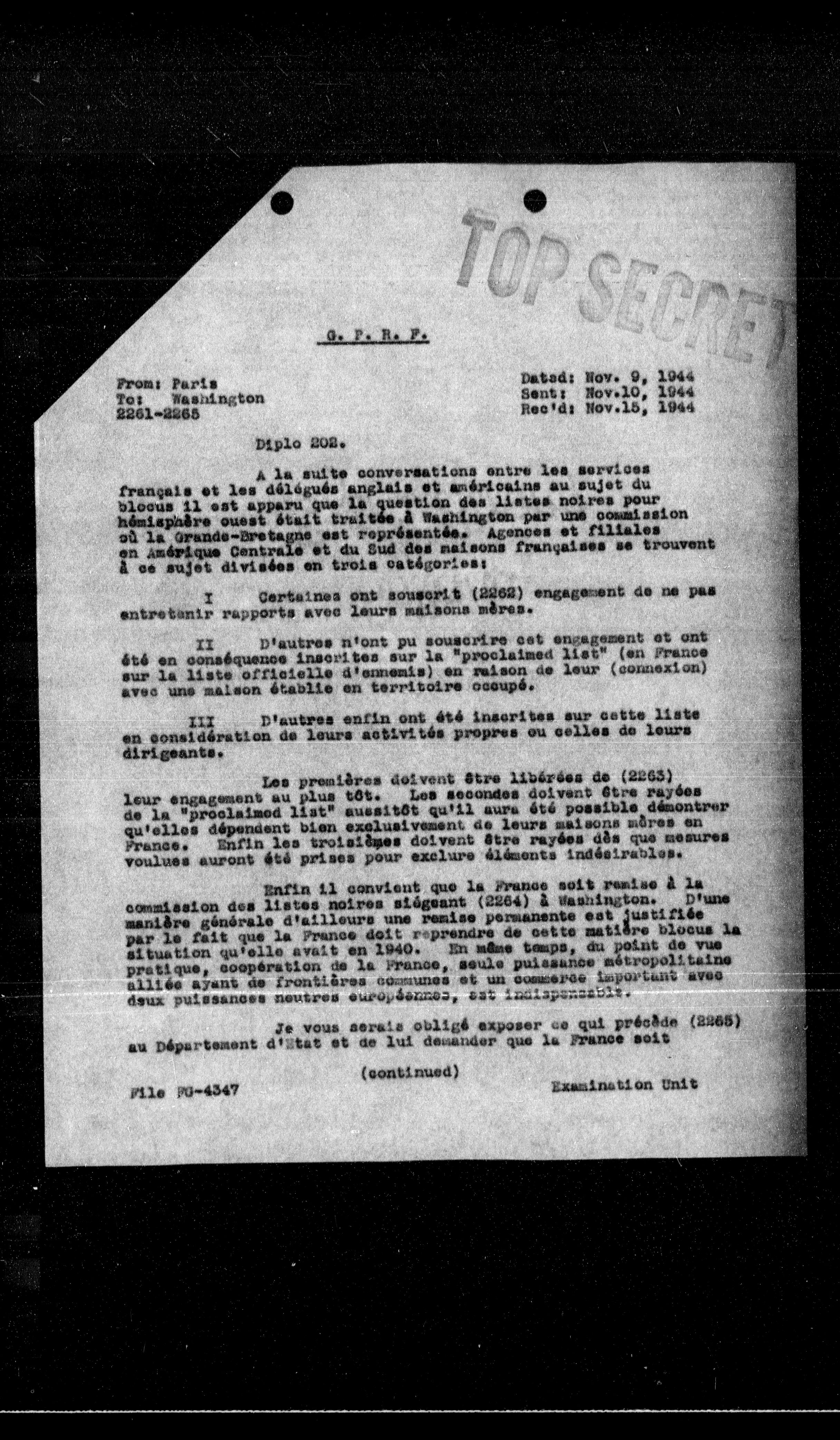 Enfin il convient que la France soit remise à la commission des listes noires siégeant (2264) à Washington. D'une manière générale d'ailleurs une remise permanente est justifiée par le fait que la France doit reprendre de cette matière blocus la situation qu'elle avait en 1940. En même temps, du point de vue pratique, coopération de la France, seule puissance métropolitaine allée ayant de frontières communes et un commerce important avec deux puissances neutres européennes, est indispensable.