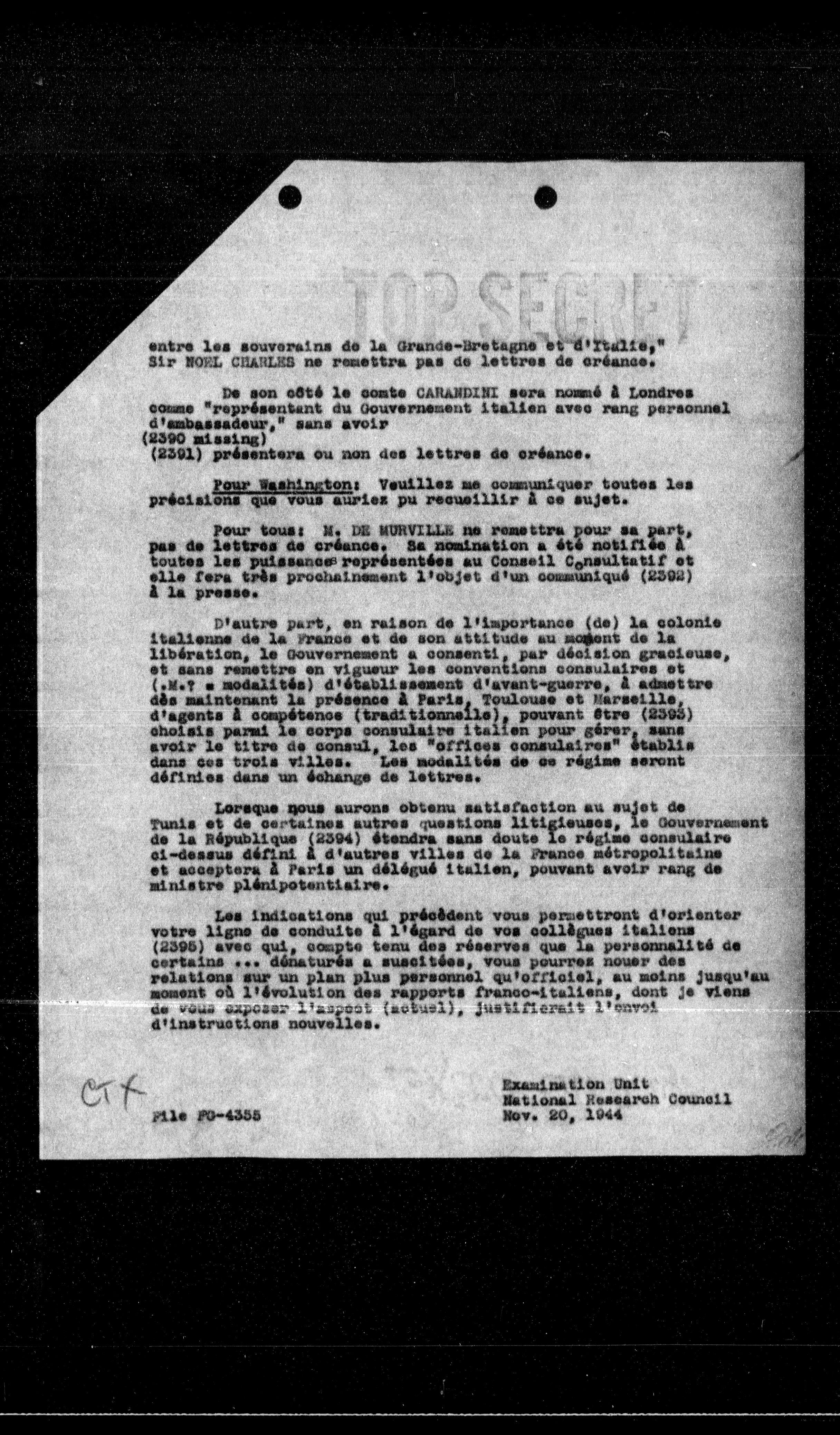 D'autre part, en raison de l'importance (de) la colonie italienne de la France et de son attitude au moment de la libération, le Gouvernement a consenti, par décision gracieuse, et sans remettre en vigueur les conventions consulaires et (.M.T = modalités) d'établissement d'avant-guerre, à admettre dès maintenant la présence à Paris, Toulouse et Marseille, d'agents à compétence (traditionnelle), pouvant être (2593) choisis parmi le corps consulaire italien pour gérer, sans avoir le titre de consul, les "offices consulaires" établis dans ces trois villes. Les modalités de ce régime seront définies dans un échange de lettres.