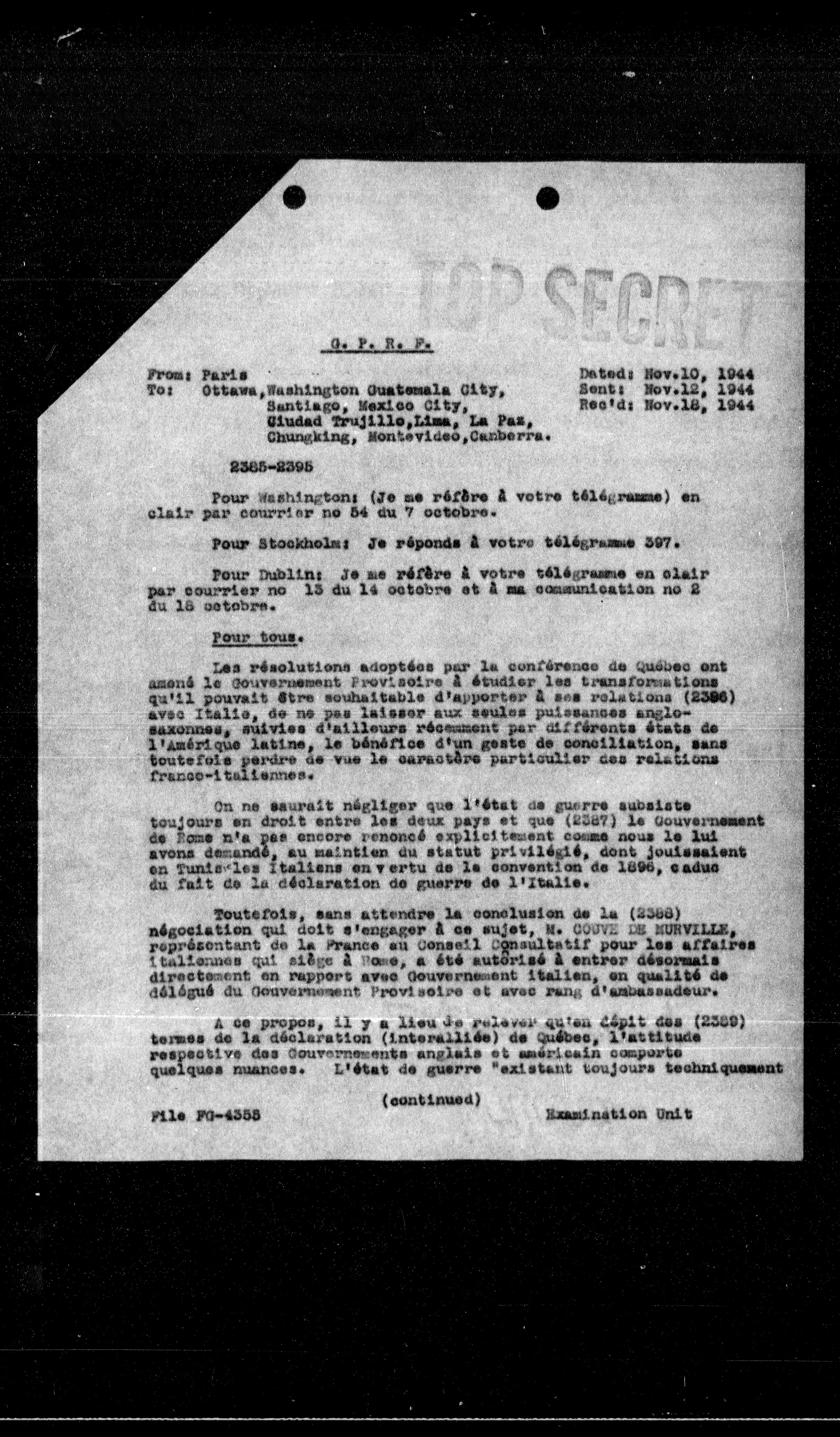 Les résolutions adoptées par la conférence de Québec ont amené le Gouvernement Provisoire à étudier les transformations qu'il pouvait être souhaitable d'apporter à ses relations (2386) avec Italie, de ne pas laisser aux seules puissances anglosaxonnes, suivies d'ailleurs récemment par différents états de l'Amérique latine, le bénéfice d'un geste de conciliation, sans toutefois perdre de vue le caractère particulier des relations franco-italiennes.