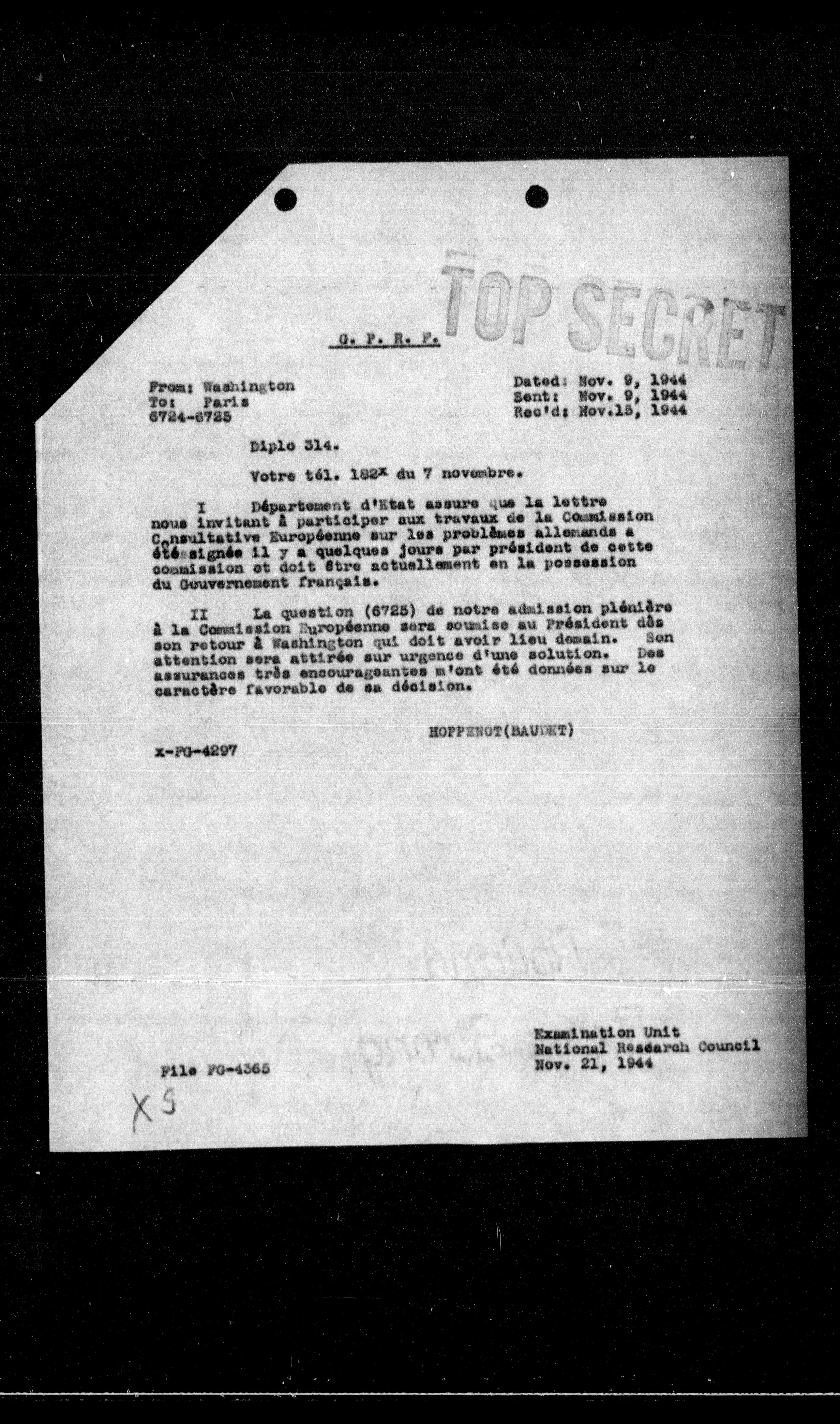 I **Département d'État assure que la lettre nous invitant à participer aux travaux de la Commission consultative Européenne sur les problèmes allemands à 2000 signés il y a quelques jours par président de cette commission et doit être actuellement en la possession du Gouvernement français.**
