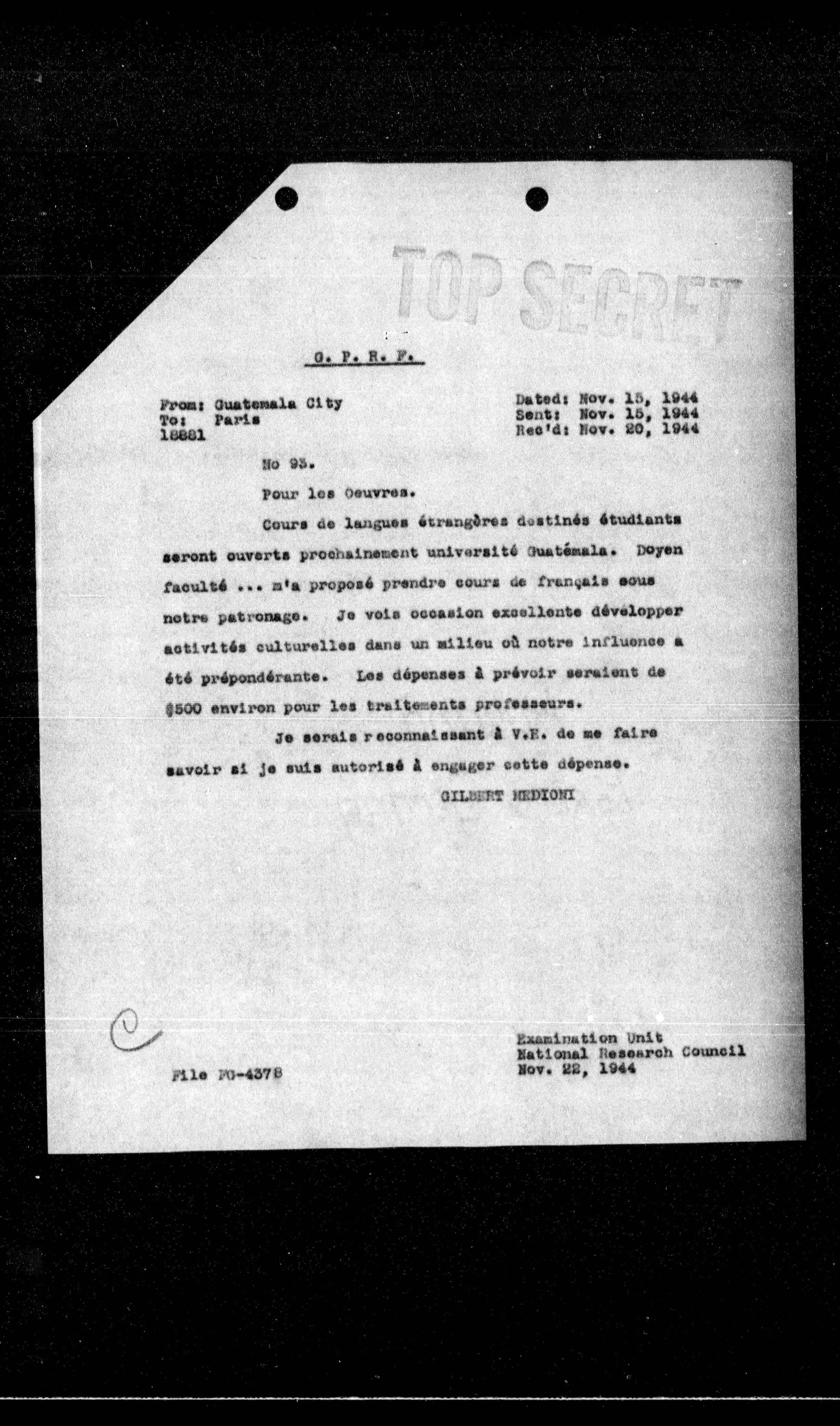 Cours de langues étrangères destinés étudiants seront ouverts prochainement université Guatemala. Doyen faculté ... m'a proposé prendre cours de français sous notre patronage. Je vois occasion excellente développer activités culturelles dans un milieu où notre influence a été prépondérante. Les dépenses à prévoir seraient de $500 environ pour les traitements professeurs.