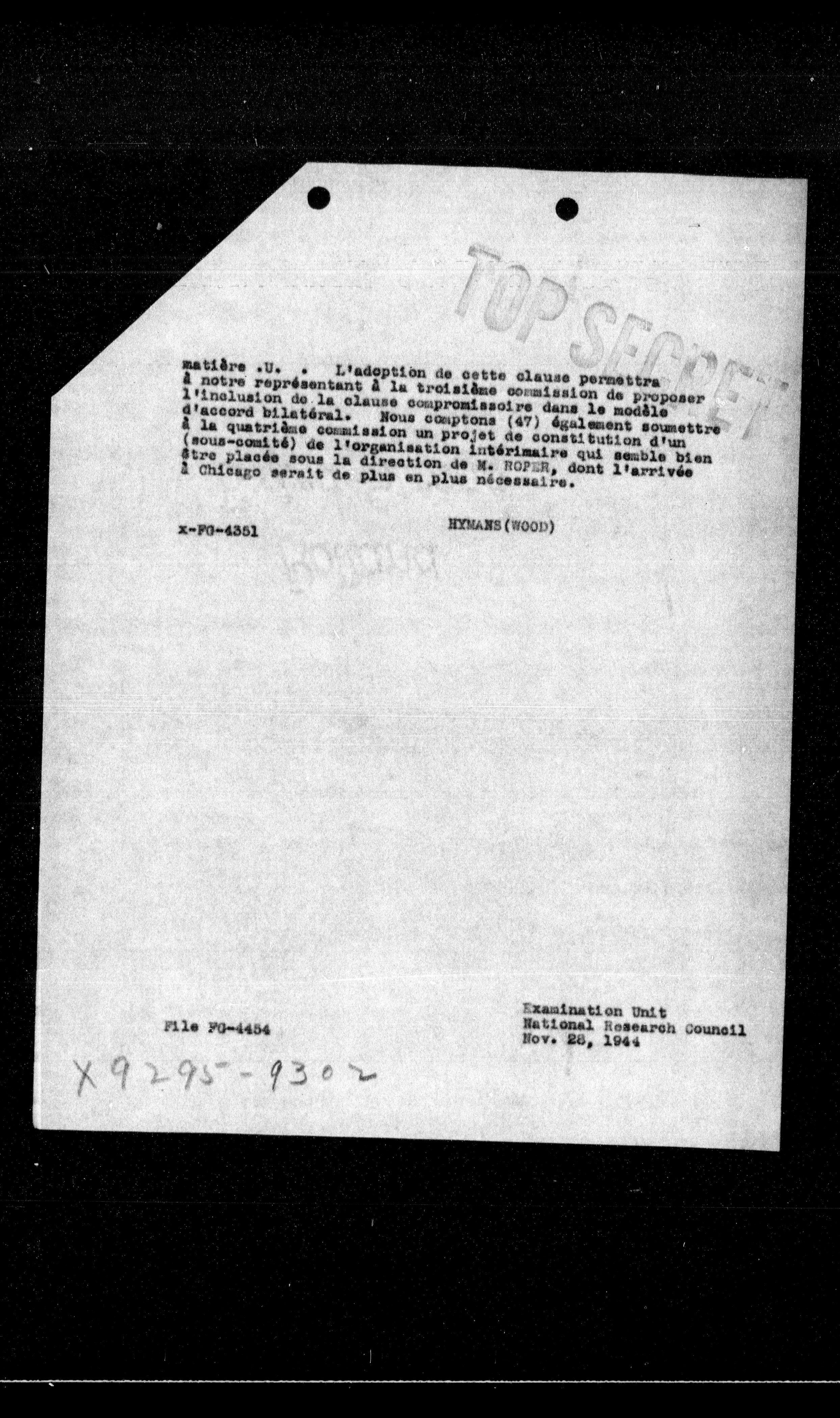 - # Matière .U. L'adoption de cette clause permettra à notre représentant à la troisième commission de proposer l'inclusion de la clause compromissoire dans le modèle d'accord bilatéral. Nous comptons (47) également soumettre à la quatrième commission un projet de constitution d'un (sous-comité) de l'organisation intérimaire qui semble bien être placée sous la direction de M. ROPER, dont l'arrivée à Chicago serait de plus en plus nécessaire.