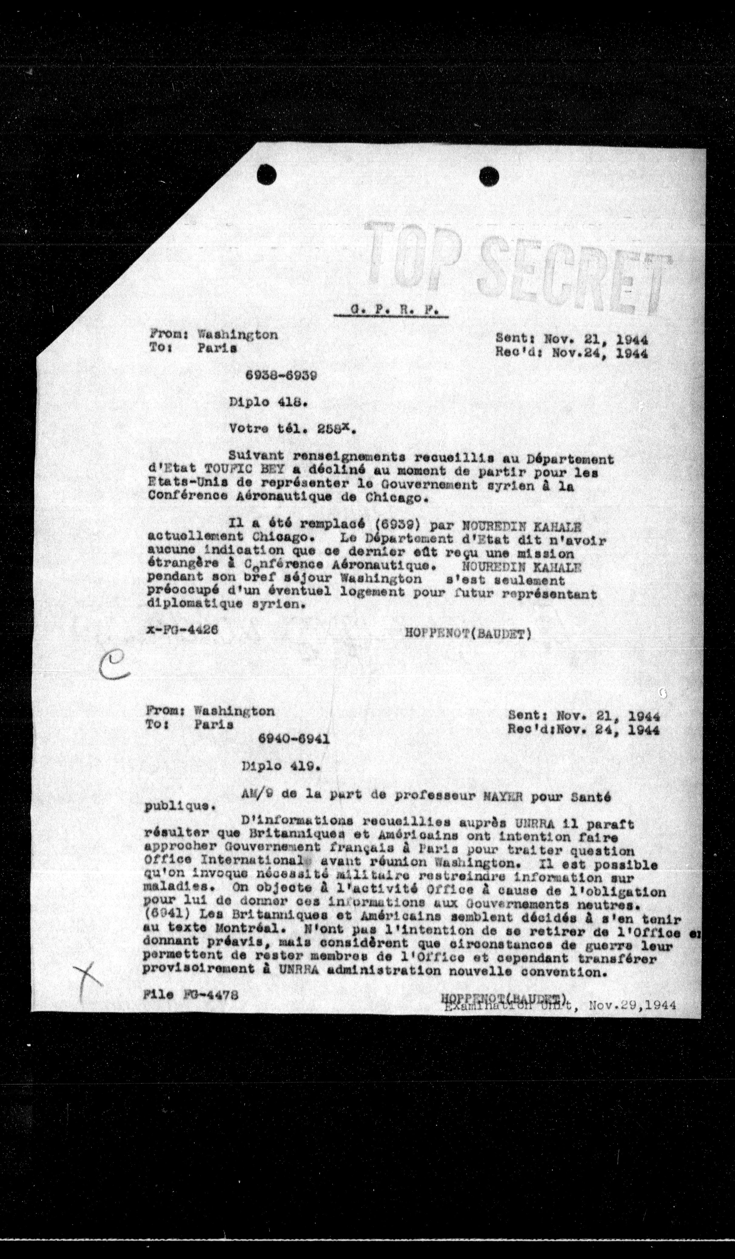 Il a été remplacé (6939) par NOUREDIN KANALE actuellement Chicago. Le Département d'Etat dit n'avoir aucune indication que ce dernier eût reçu une mission étrangère à Conférence Aéronautique. NOUREDIN KANALE pendant son bref séjour Washington s'est seulement préoccupé d'un éventuel logement pour futur représentant diplomatique syrien.