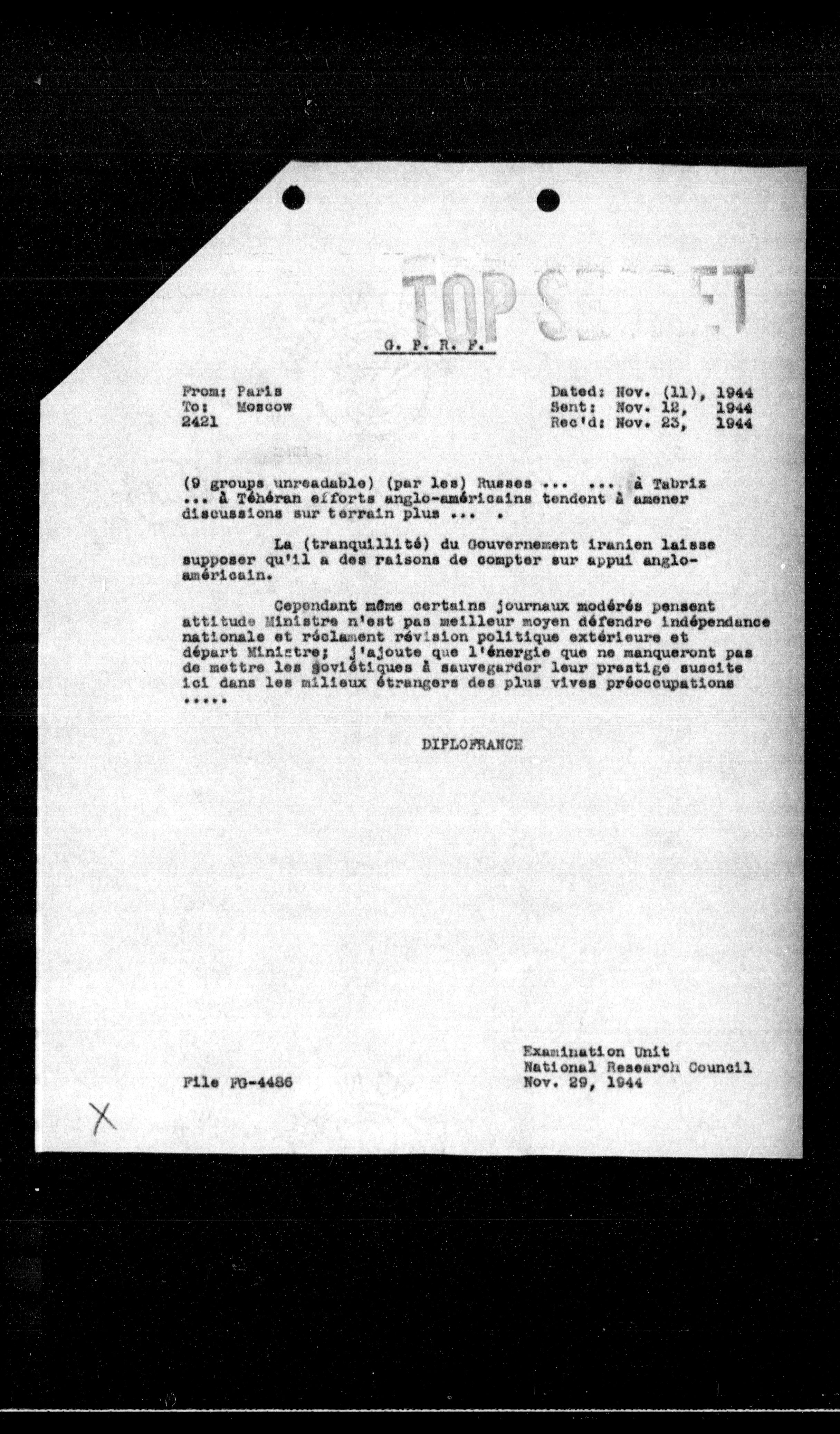 ( 9 groups unreadable) (par les) Russes ... ... a Tabriz ... a Téhéran eiforts anglo-américains tendent a amener discussions sur terrain plus ...