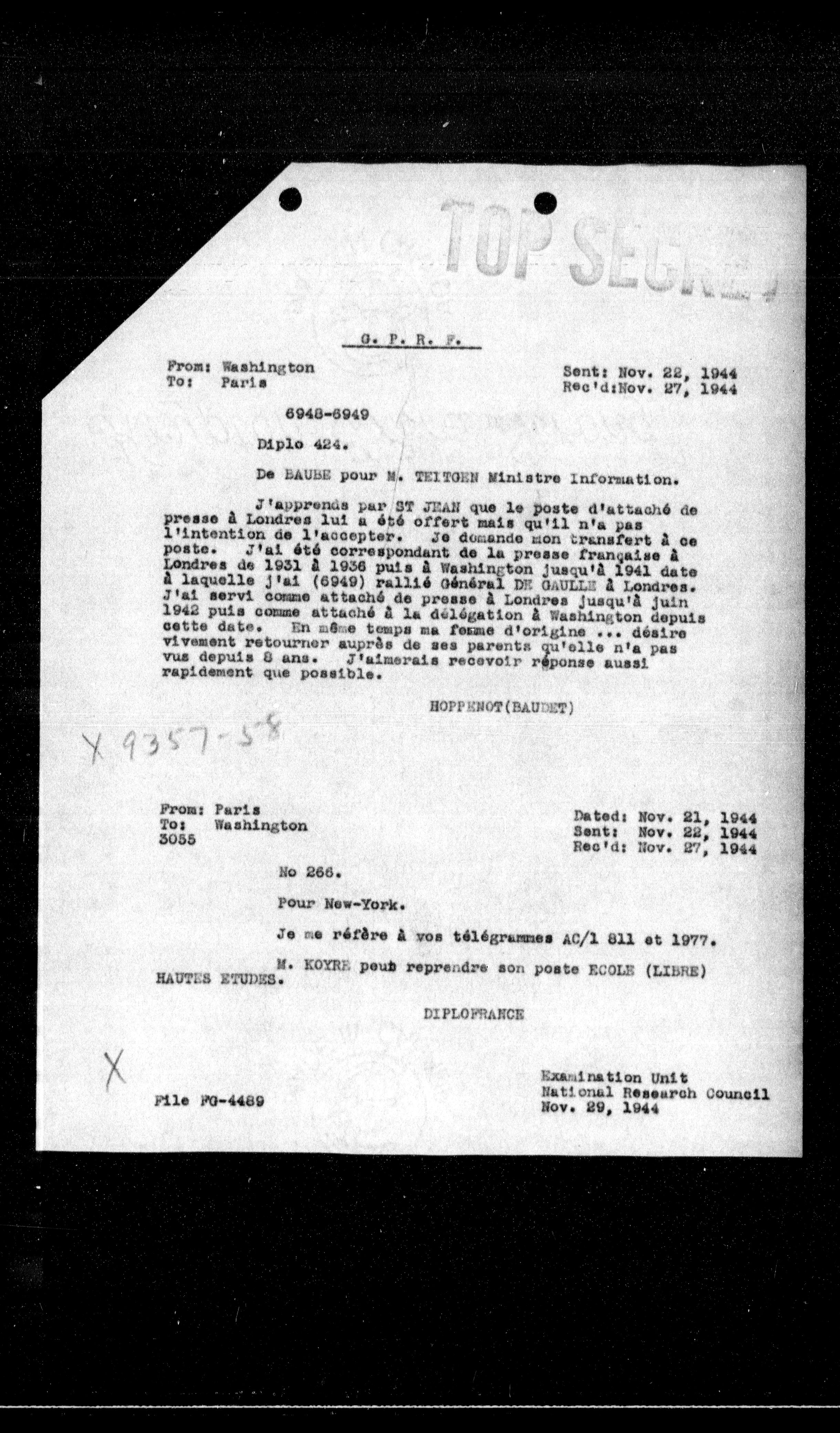 J'apprends par ST JEAN que le poste d'attaché de presse à Londres lui a été offert mais qu'il n'a pas l'intention de l'accepter. Je demande mon transfert à ce poste. J'ai été correspondant de la presse française à Londres de 1931 à 1936 puis à Washington jusqu'à 1941 date à laquelle j'ai (6949) rallié Général DE GAULLE à Londres. J'ai servi comme attaché de presse à Londres jusqu'à juin 1942 puis comme attaché à la délégation à Washington depuis cette date. En même temps ma femme d'origine ... désire vivement retourner auprès de ses parents qu'elle n'a pas vus depuis 8 ans. J'aimerais recevoir réponse aussi rapidement que possible.