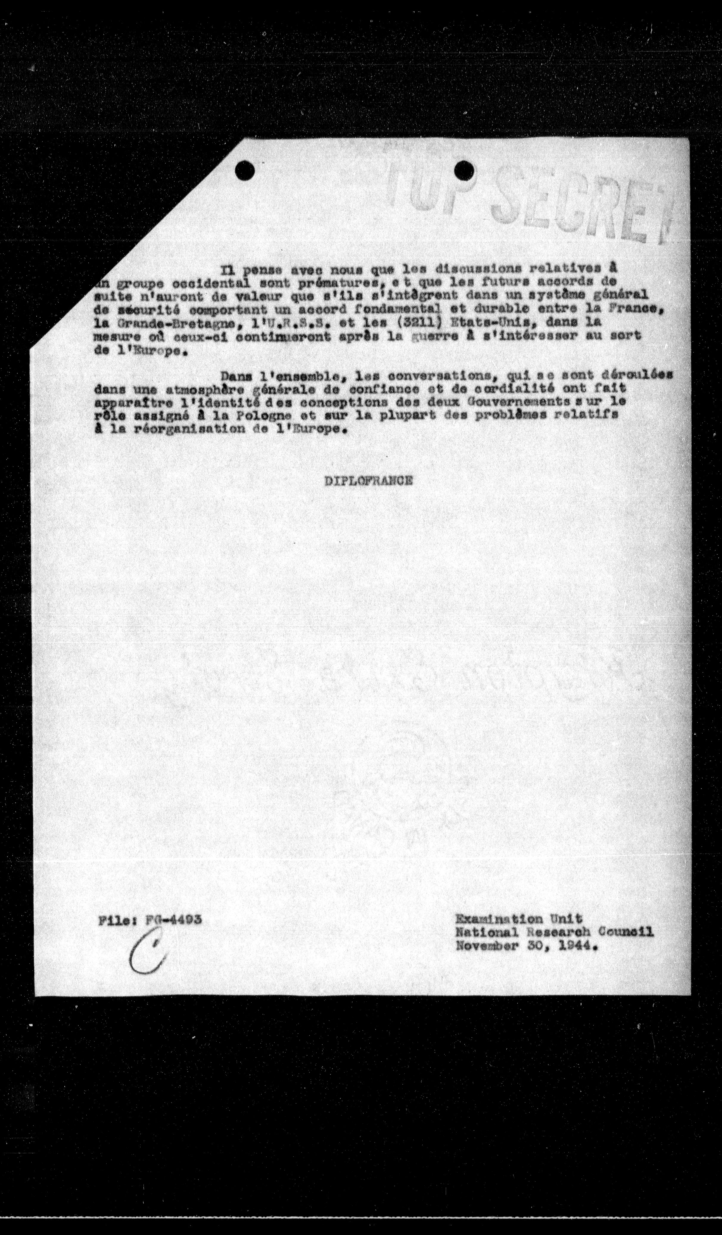 - Il pense avec nous que les discussions relatives à un groupe occidental sont prématurées, et que les futurs accords de suite n'auront de valeur que s'ils s'intègrent dans un système général de sécurité comportant un accord fondamental et durable entre la France, la Grande-Bretagne, l'U.R.S.S. et les (3211) États-Unis, dans la mesure où ceux-ci continueront après la guerre à s'intéresser au sort de l'Europe.