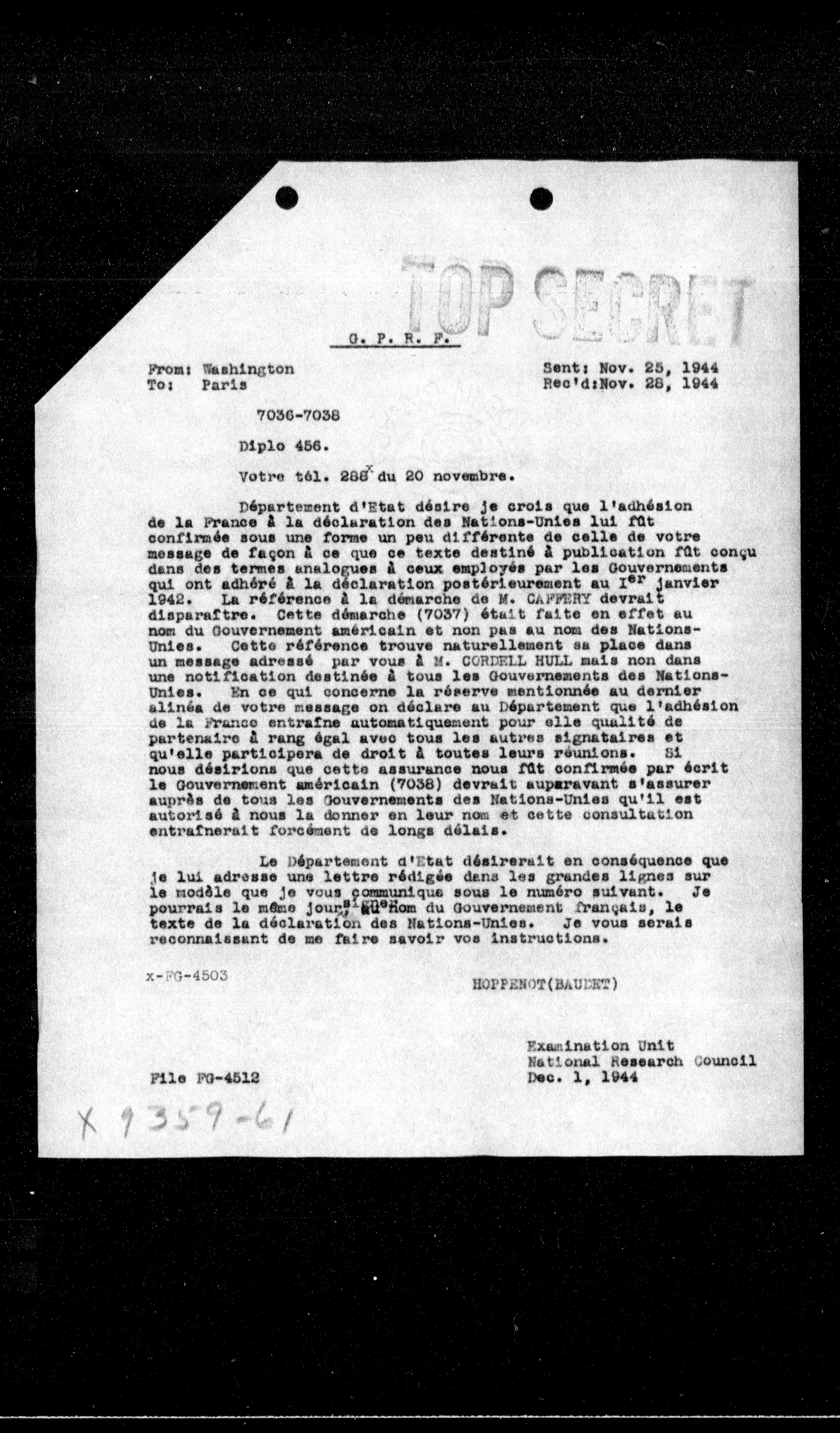 Département d'Etat désire je crois que l'adhésion de la France à la déclaration des Nations-Unies lui fut confirmée sous une forme un peu différente de celle de votre message de façon à ce que ce texte destiné à publication fut conçu dans des termes analogues à ceux employés par les Gouvernements qui ont adhéré à la déclaration postérieurement au $1^{\text {er }}$ janvier 1942. La référence à la démarche de M. GAPPERY devrait disparaitre. Cette démarche (7037) était faite en effet au nom du Gouvernement américain et non pas au nom des NationsUnies. Cette référence trouve naturellement sa place dans un message adressé par vous à M. CORDELL HULL mais non dans une notification destinée à tous les Gouvernements des NationsUnies. En ce qui concerne la réserve mentionnée au dernier alinéa de votre message on déclare au Département que l'adhésion de la France entraine automatiquement pour elle qualité de partenaire à rang égal avec tous les autres signataires et qu'elle participera de droit à toutes leurs réunions. Si nous désirions que cette assurance nous fut confirmée par écrit le Gouvernement américain (7038) devrait auparavant s'assurer auprès de tous les Gouvernements des Nations-Unies qu'il est autorisé à nous la donner en leur nom et cette consultation entrainerait forcément de longs délais.