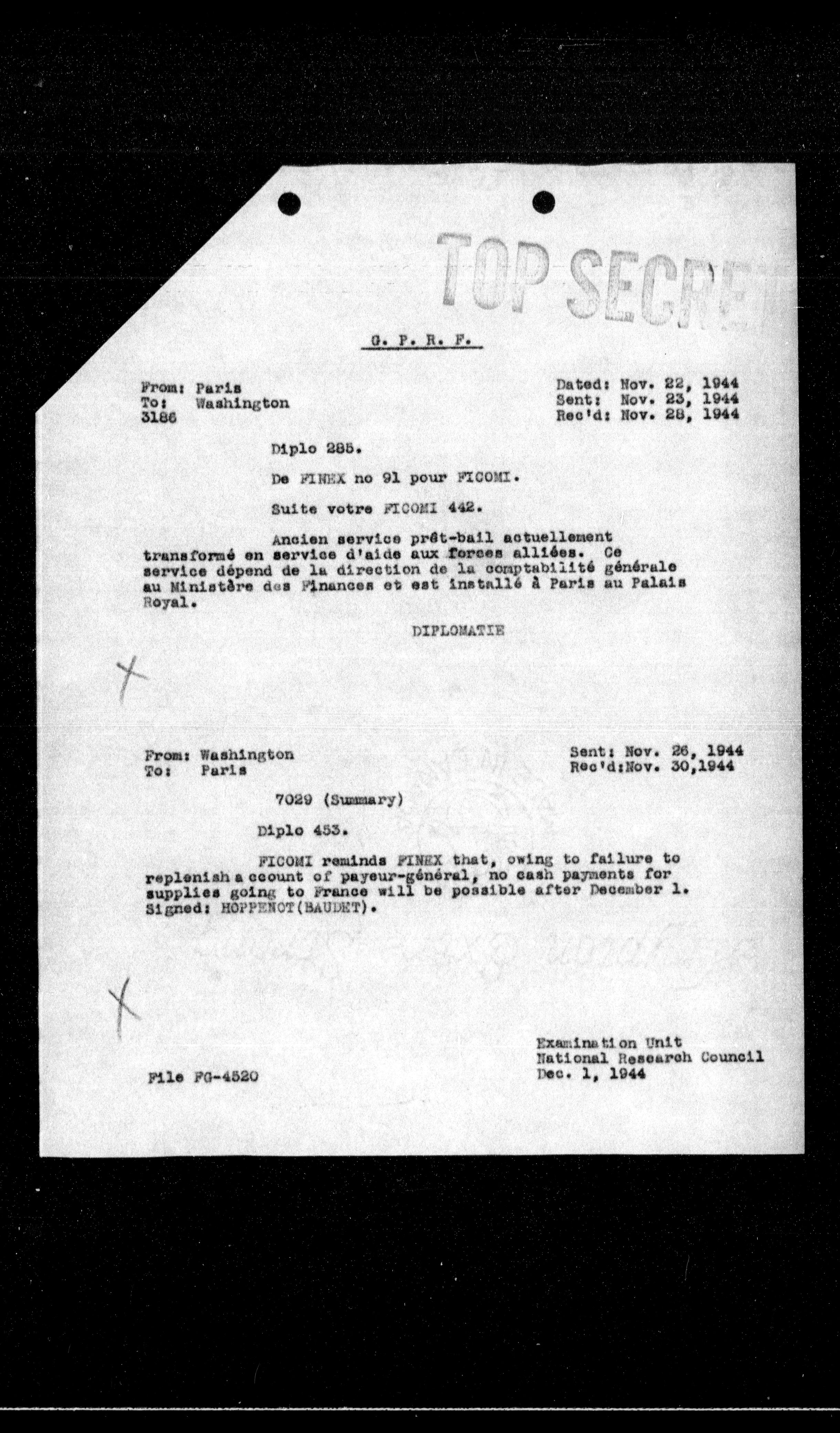 FICOMI reminds FINEX that, owing to failure to replenish a ccount of payeur-général, no cash payments for supplies going to France will be possible after December 1. Signed: HOPPENOT(BAUDET).