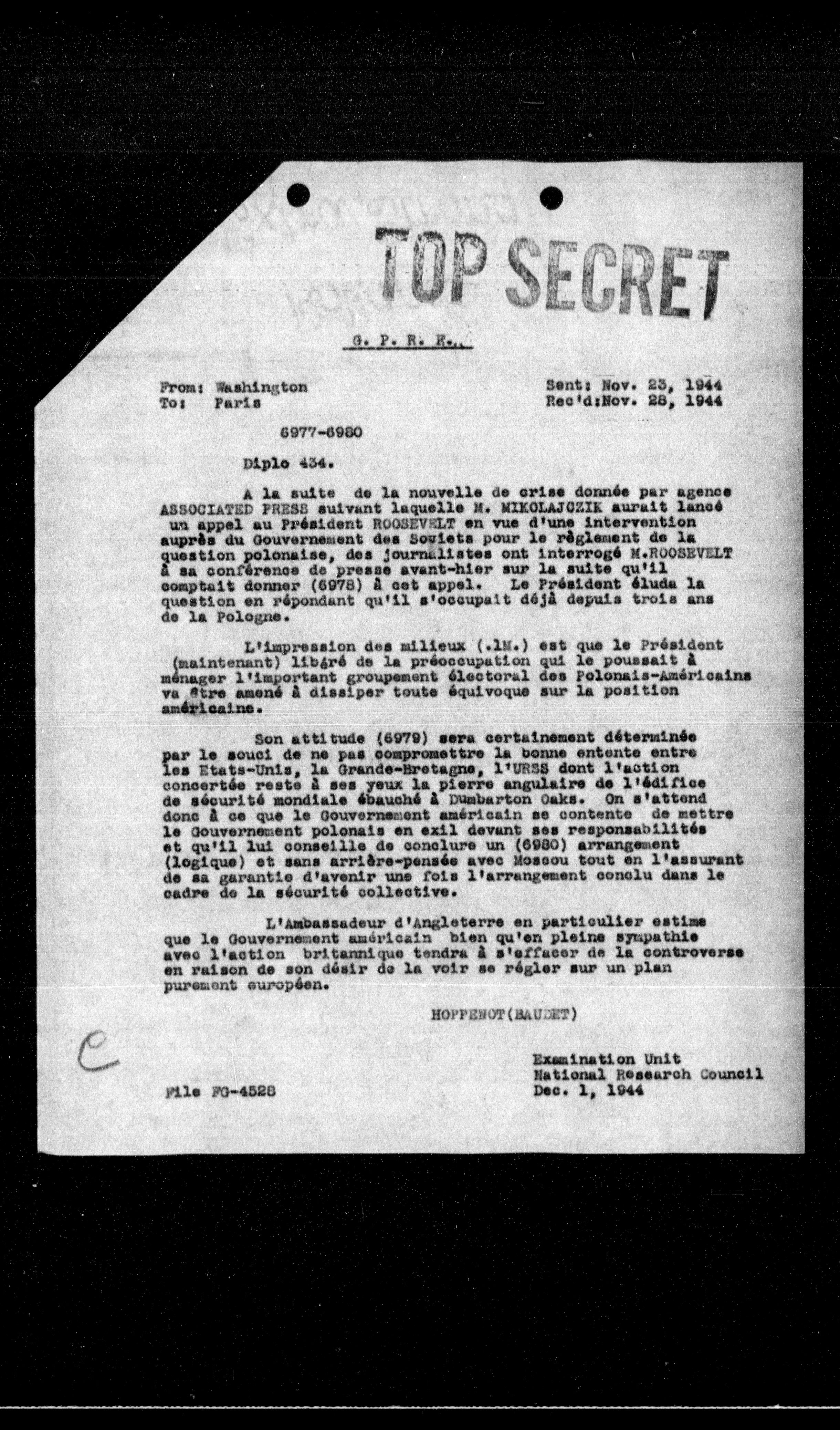 Son attitude (6979) sera certainement déterminée par le souci de ne pas compromettre la bonne entente entre les Etats-Unis, la Grande-Bretagne, l'URSS dont l'action concertée reste à ses yeux la pierre angulaire de l'édifice de sécurité mondiale ébauché à Dumbarton Oaks. On s'attend donc à ce que le Gouvernement américain se contente de mettre le Gouvernement polonais en exil devant ses responsabilités et qu'il lui conseille de conclure un (6980) arrangement (logique) et sans arrière-pensée avec Moscou tout en l'assurant de sa garantie d'avenir une fois l'arrangement conclu dans le cadre de la sécurité collective.