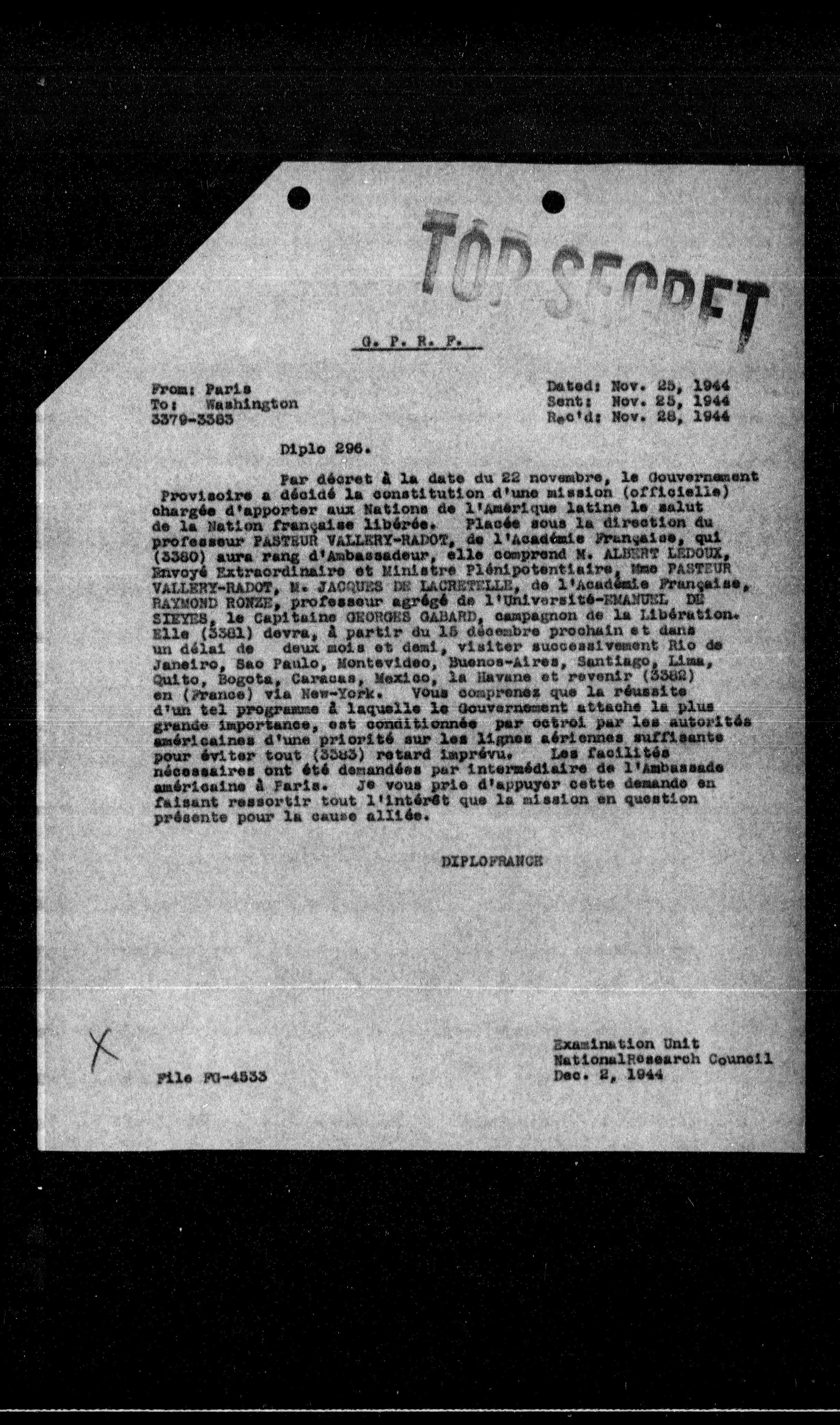 Provisoire a décidé la constitution d'une mission (officielle) chargée d'apporter aux Nations de l'Amérique latine le salut de la Nation française libérée. Placée sous la direction du professeur FABTEUR VALLENT-RADOT, de l'Académie Française, qui (3360) aura reçu d'intéressé par, elle comprend M. JENEZY LABOUR, envoyé Extraordinaire et Ministre Plénipotentiaire, Mme FABTEUR VALLENT-RADOT, M. JACQUES DE PYRETELLE, de l'Académie Française, R. GUERREL RODRIGUEZ, professeur agrégé de l'Université-MAARON, C. FILTRE, le Capitaine GROUGES GABARD, compagnon de la libération. Elle (3361) devra, à partir du 15 décembre prochain et dans un délai de deux mois et demi, visiter successivement Rio de Janeiro, Sao Paulo, Montevideo, Buenos-Aires, Santiago, Lima, Quito, Bogota, Caracas, Mexico, la Havane et revenir (3362) en (France) via New-TorR. Vous comprenez que la réussite d'un tel programme à laquelle le Gouvernement attache la plus grande importance, est conditionnée par cetroi par les autorités américaines d'une priorité sur les signes abjér鹰nif suffisante pour éviter tout (3363) retard Cap-OTU. Les facilités nécessaires ont été demandées par intermédiaire de l'Ambassade américaine à Paris. Je vous prie d'appuyer cette demande en faisant ressortir tout l'intérêt que la mission en question présente pour la cause alliée.