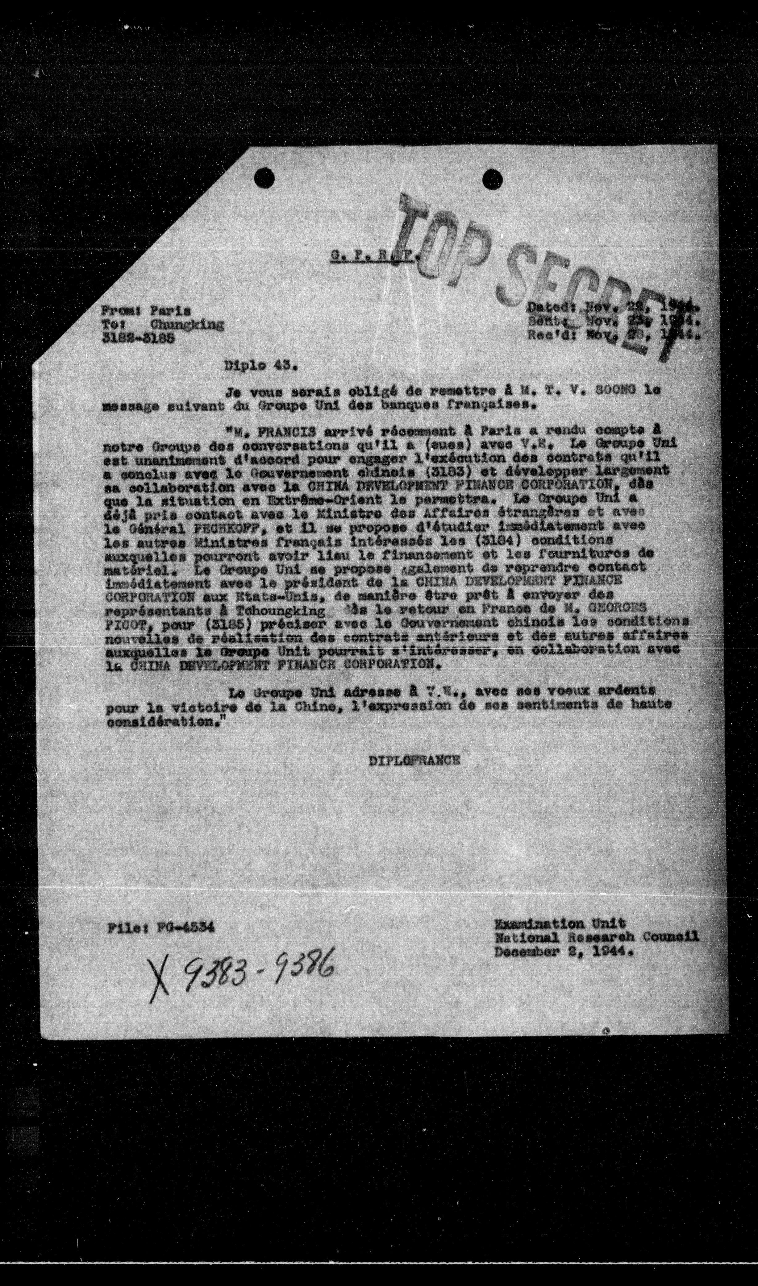 "M. FRANCIS arrive récemment à Paris a rendu compte à notre Groupe des conversations qu'il a (euro) avec V.R. Le Groupe Uni est unanimement d'accord pour engager l'exécution des contrats qu'il a conclus avec le Gouvernement chinois (S183) et développer largement sa collaboration avec la CHINA DEVELOPMENT FINANCE CORPORATION, dès que la situation en entranta-tient le permettra. Le Groupe Uni a déjà pris contact avec le Ministre des Affaires étrangères et avec le Général PEDREOFF, et il se propose d'étudier immédiatement avec les autres Ministres français intéressés les (S184) conditions auxquelles pourront avoir lieu le financement et les fournitures de matériel. Le Groupe Uni se propose également de reprendre contact immédiatement avec le président de la CHINA DEVELOPMENT FINANCE CORPORATION aux États-Unis, de manière être prêt à envoyer des représentants à Tchoungking dès le retour en France de M. GEORGES PICOT, pour (S185) préciser avec le Gouvernement chinois les conditions nouvelles de réalisation des contrats antérieurs et des autres affaires auxquelles le Groupe Uni pourrait s'intéresser, en collaboration avec la CHINA DEVELOPMENT FINANCE CORPORATION.