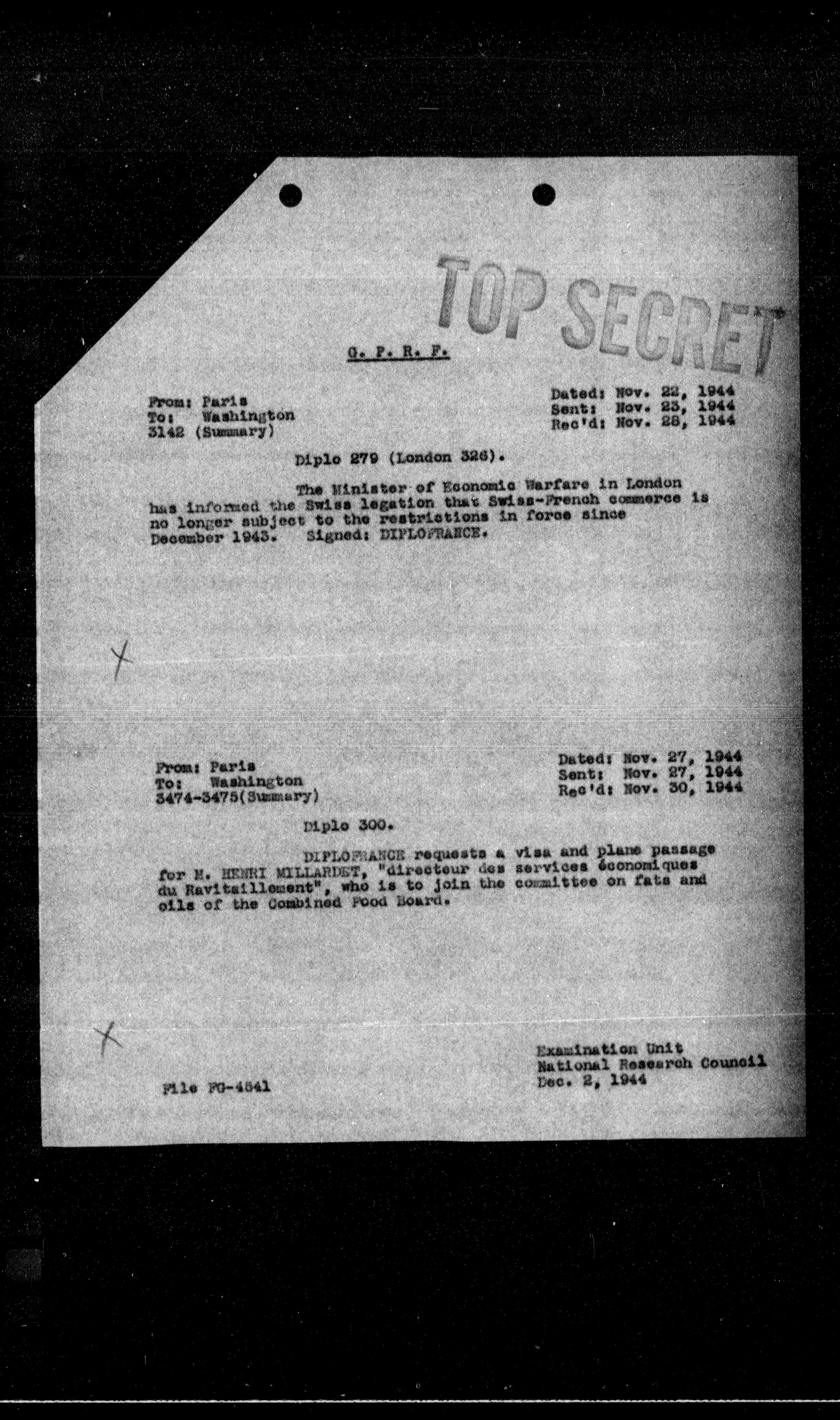 The Minister of Economic Warfare in London has informed the Swiss legation that Swiss-French commerce is no longer subject to the restrictions in force since December 1943. Signed: **DIPLOFRANCE.**