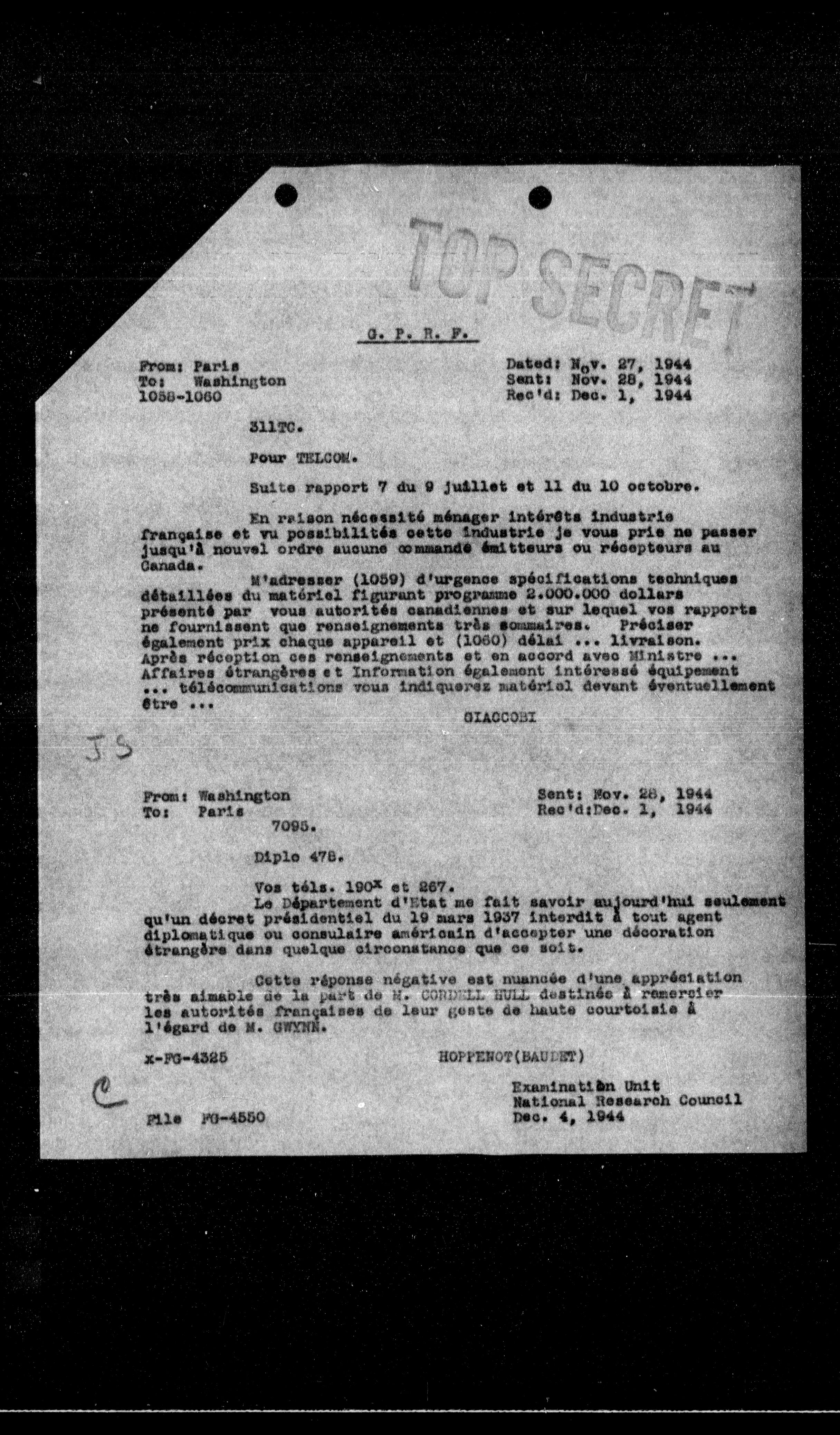 Le Département d'État me fait savoir aujourd'hui seulement qu'un décret présidentiel du 19 mars 1937 interdit tout agent diplomatique ou consulaire américain d'accepter une décoration étrangère dans quelque circonstance que ce soit.