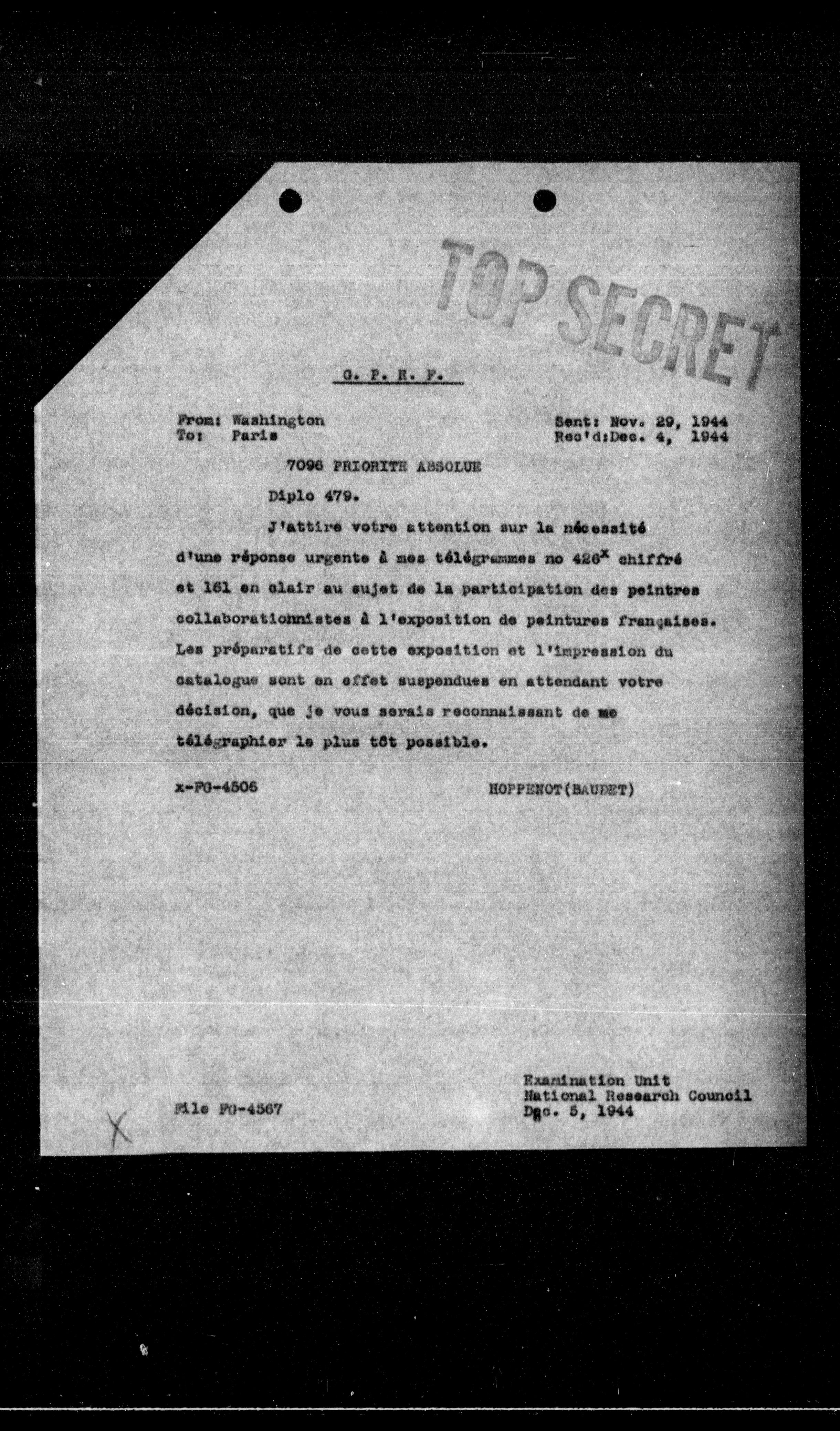 J'attire votre attention sur la nécessité d'une réponse urgente à mes tólégremmes no $426^{x}$ chiffré et 161 en clair au sujet de la participation des peintres collaborationnistes a l'exposition de peintures françaises. Les préparatifs de cette exposition et l'impression du catalogue sont en effet suspendues en attendant votre décision, que je vous serais reconnaissant de me tólegraphier le plus tôt possible.
