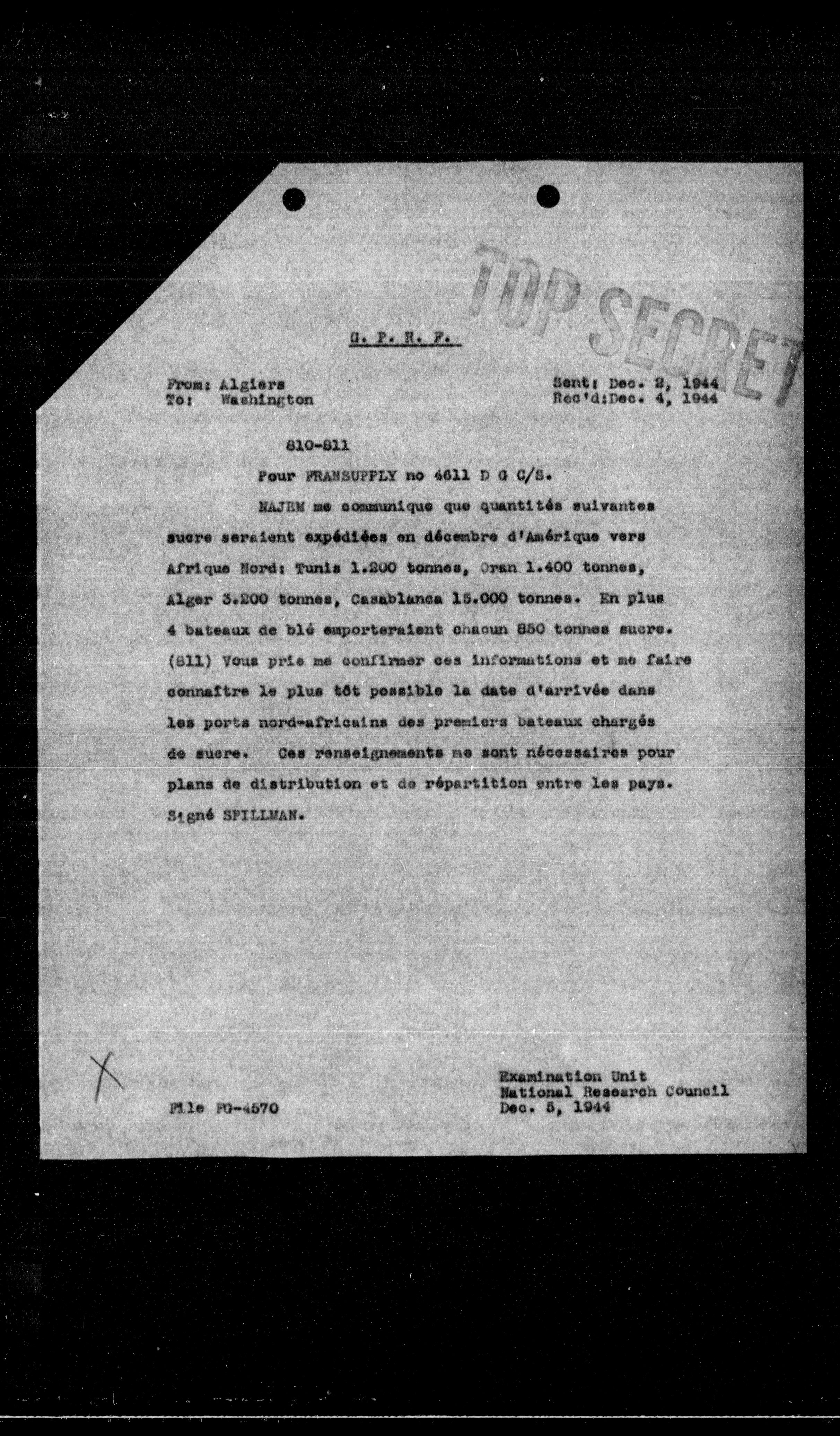 sucre seraient expédiées en décembre d'Amérique vers Afrique Nord: Tunis 1.200 tonnes, oran 1.400 tonnes, Alger 3.200 tonnes, Casablanca 13.000 tonnes. En plus 4 bateaux de blé emporteraient chacun 850 tonnes sucre. (611) Vous prie me confirmer ces informations et me faire connaître le plus tôt possible la date d'arrivée dans les ports nord-africains des premiers bateaux chargés de sucre. Ces renseignements me sont nécessaires pour plans de distribution et de répartition entre les pays. Stgné SPILLMAN.