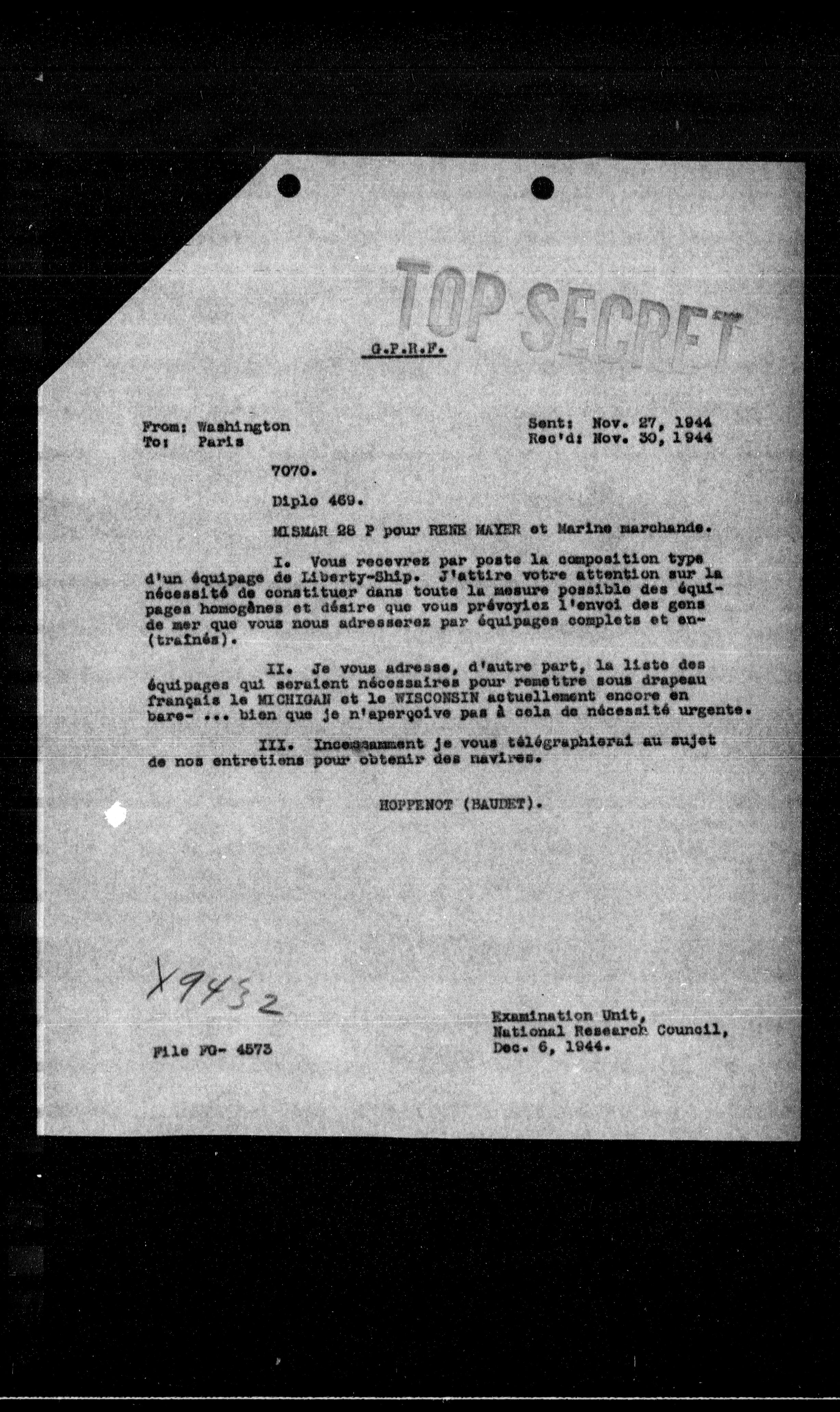 II. Je vous adresse, d'autre part, la liste des équipages qui seraient nécessaires pour remettre sous drapeau français le MICHIGAN et le WISCONSIN actuellement encore en baro- ... bien que je n'aperçoive pas à cela de nécessité urgente.