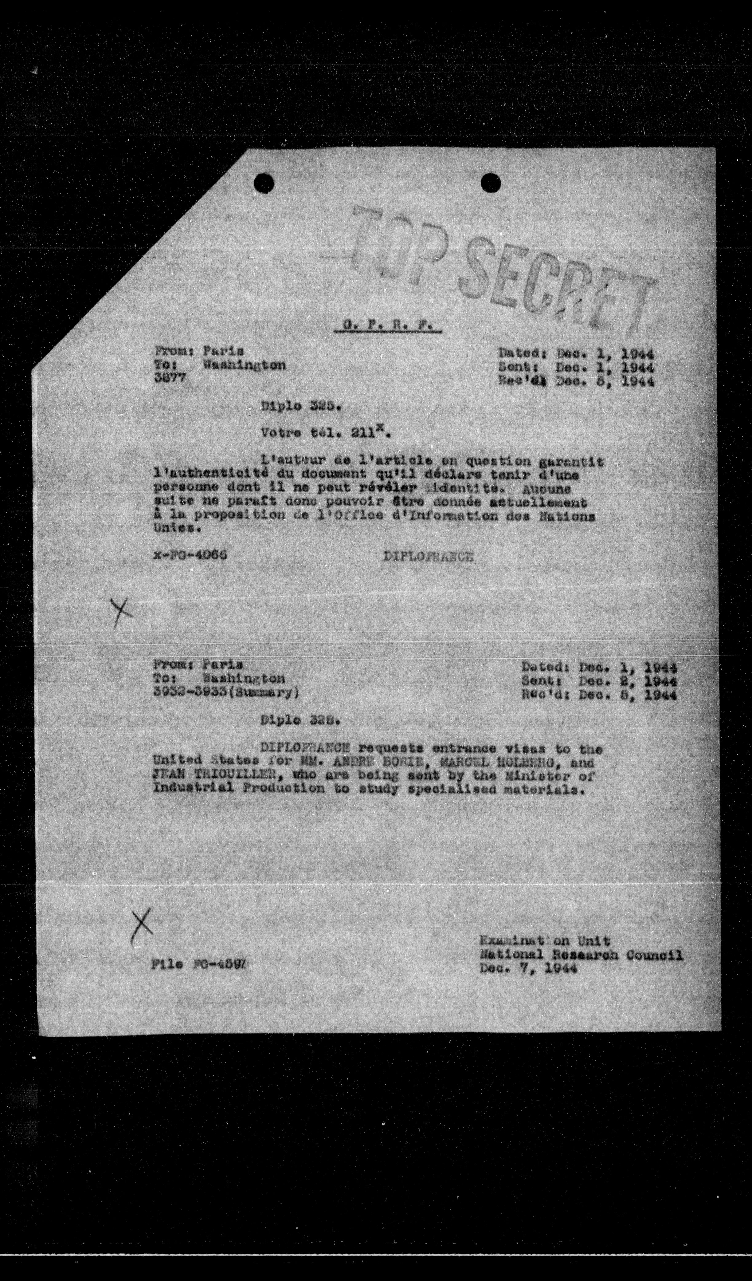 **From:** Paris **To:** Washington **Date:** Dec. 1, 1944 **Date:** Dec. 1, 1944 **Rec'd:** Dec. 8, 1944