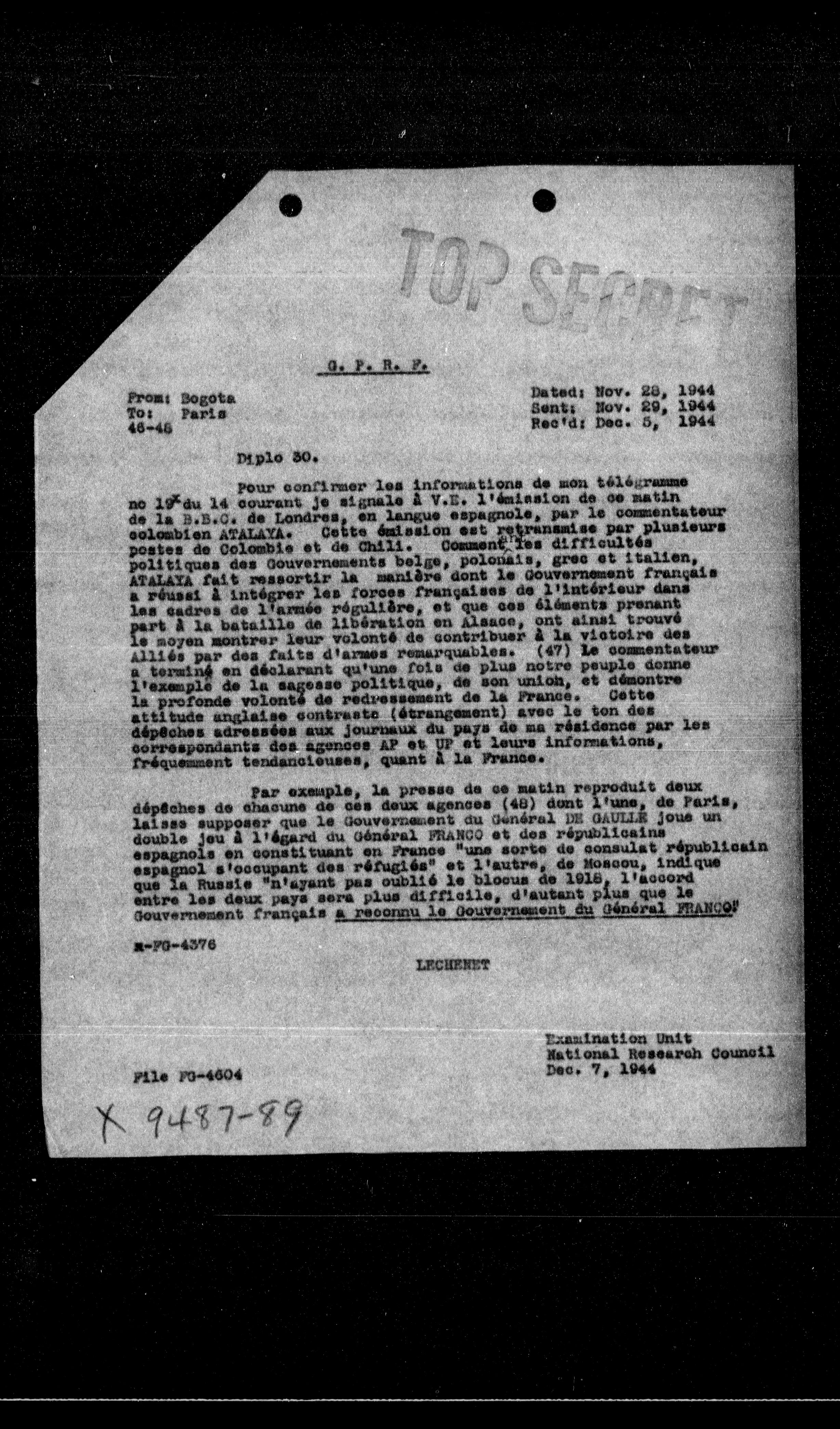 Pour coniîmer les informations de mon télégrame ne $19^{\circ}$ du 14 courant je signale à V.E. l'émission de ce matin de la B.B.C. de Londres, en longue espagnole, par le comentateur colombien ANGELI. Cette mission est retransmise par plusieurs postes de Colombie et de Chili. Comment, les difficultés politiques des Gouvernements ocóga, polonais, grec et italien, ANGELI fait ressortir la mabíre dont le Gouvernement français a réussi à intégrer les forces françaises de l'intérieur dans les cadres de l'armée régulière, et qui ces éléments prenant part à la bataille de libération en libace, ont ainsi trouvé le moyen montrer leur volonté de contribuer à la victoire des alliés par des faits d'armes remarquables. (47) Le commentateur a terminé en déclarant qu'une fois de plus notre peuple donne l'exemple de la sagesse politique, de son union, et démontre la profonde volonté de redressement de la France. Cette attitude anglaise contraste (étrangement) avec le ton des démêches adressées aux journaux du pays de ma résidence par les correspondants des agences AP et UP et leurs informations, fréquemment tendenoieuses, quant à la France.
