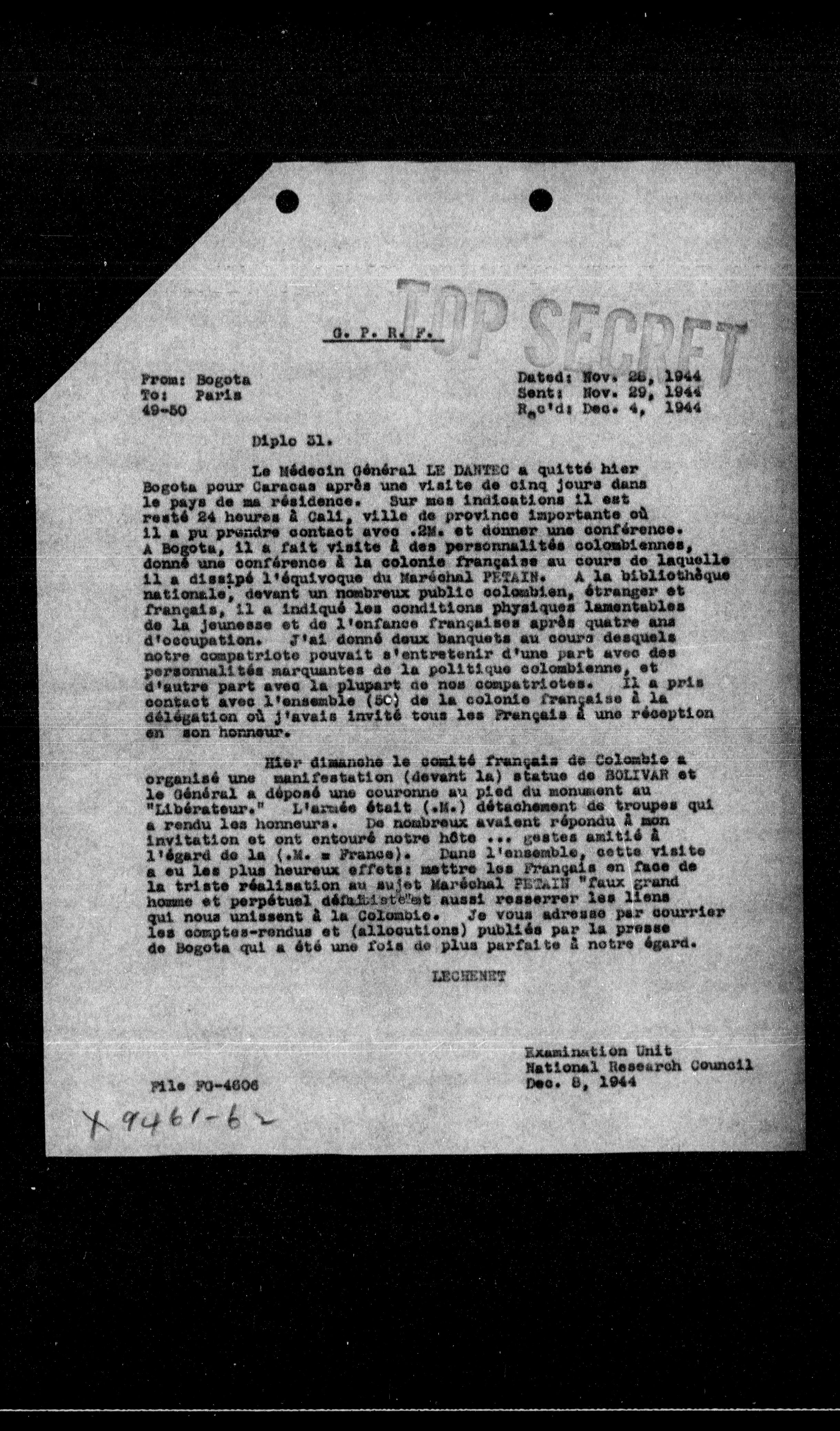 Le médecin général LE DANTEC a quitté hier Bogota pour Caracas après une visite de cinq jours dans le pays de ma résidence. Sur mes indications il est resté 24 heures à Cali, ville de province importante où il a pu prendre contact avec .RW. et donner une conférence. À Bogota, il a fait visite à des personnalités colombiennes, donne une conférence à la colonie française au cours de laquelle il a dissipé l'équivoque du Maréchal FÉTAIN. À la bibliothèque nationale, devant un nombreux public colombien, étranger et français, il a indiqué les conditions physiques lamentables de la jeunesse et de l'enfance françaises après quatre ans d'occupation. J'ai donné deux banquets au cours desquels notre compatriote pouvait s'entretenir d'une part avec des personnalités marquantes de la politique colombienne, et d'autre part avec la plupart de nos compatriotes. Il a pris contact avec l'ensemble (20) de la colonie française à la délégation où j'avais invité tous les Français à une réception en son honneur.