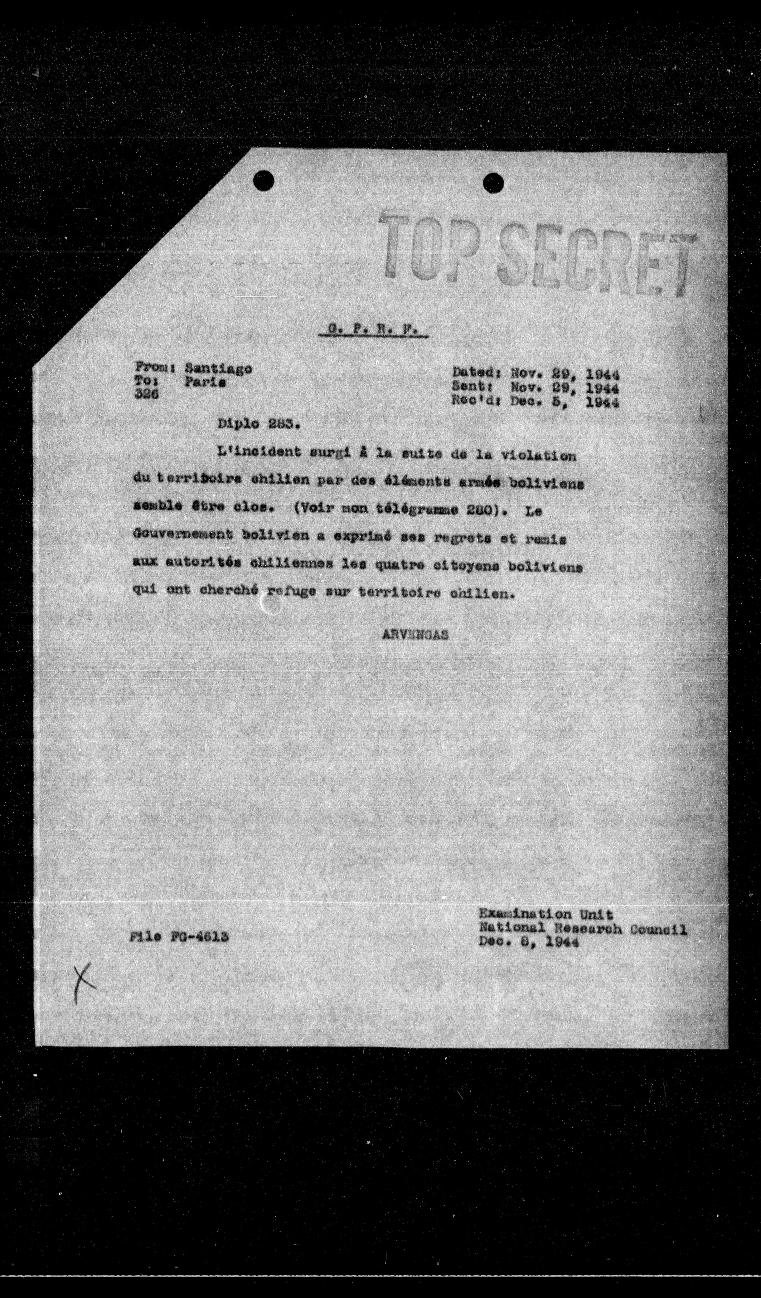 L'incident surgi à la suite de la violation du territoire chilien par des éléments armés boliviens semble être clos. (Voir non tólégramme 280). Le Gouvernement bolivien a exprimé ses regrets et remis aux autorités chiliennes les quatre citoyens boliviens qui ont cherché refuge sur territoire chilien.