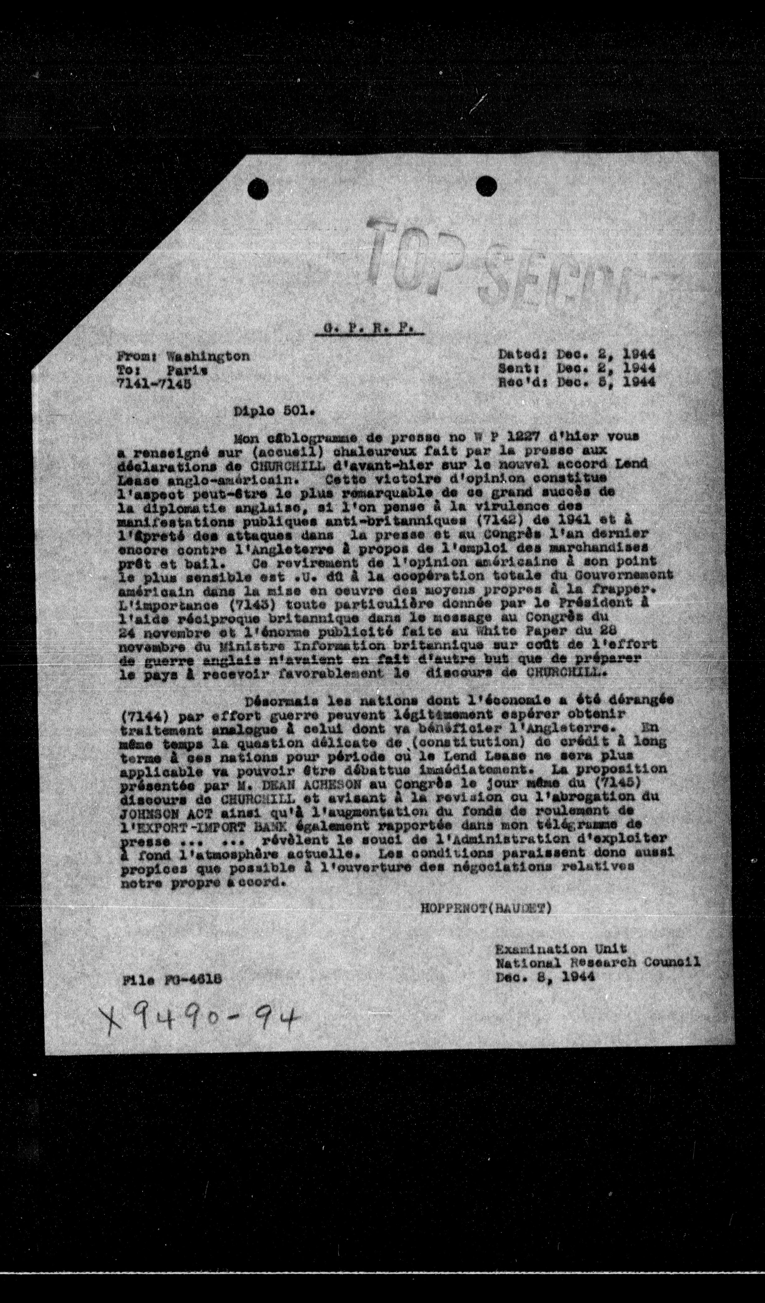 Mon câblogramme de presse no W P 1227 d'hier vous a renseigné sur (nous) plusieurs faits par la presse aux réalisations de GONZAIL. Il a été élargi sur le nouvel accord *Lond Lease* avec la presse américaine. Cette victoire d'opinion constitue l'aspect peut-être le plus remarquable de ce grand succès de la diplomatie anglaise, et l'on pense à la virulence des manifestations publiques anti-britanniques (7142) de 1941 et à l'épreté des attaques dans la presse et au congrès l'on dernier encore contre l'Angleterre à propos de l'emploi des marchandises prêt et bail. Ce revirement de l'opinion américaine à son point le plus sensible est sur la coopération totale du Gouvernement américain dans la mise en œuvre des moyens propres à la frapper. L'importance (7143) toute particulière donnée par le Président à l'aide réciproque britannique dans le message au Congrès du 24 novembre et l'énorme publicité faite au White Paper du 28 novembre du Ministre de l'Instruction britannique sur coût de l'effort de guerre anglais n'avaient en fait d'autre but que de préparer le pays à recevoir favorablement le discours de GONZAIL.