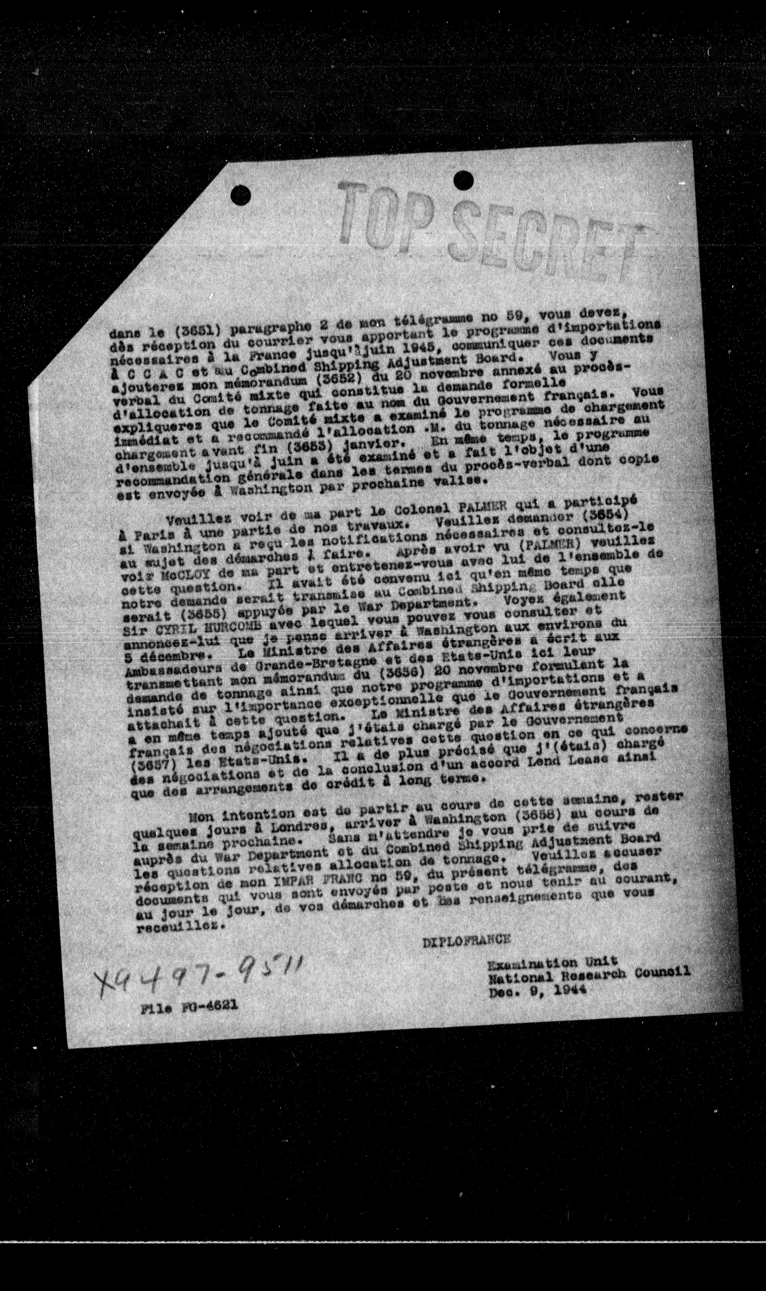 Veuillez voir de ma part le Colonel PALMER qui a participé à Paris à une partie de nos travaux. Veuillez demander (3654) si Washington a reçu les notifications nécessaires et consulter-le au sujet des démarches à faire. Après avoir vu (PALMER) veuillez voir McCLOY de ma part et entretenez-vous avec lui de l'ensemble de cette question. Il avait été convenu ici qu'en même temps que notre demande serait transmise au Combined Shipping Board elle serait (3655) appuyée par le War Department. Voyez également Sir CYNIL NURCORE avec lequel vous pouvez vous consulter et annoncez-lui que je pense arriver à Washington aux environs du 5 décembre. Le Ministre des Affaires étrangères a écrit aux Amérindiens de Grande-Bretagne et des Etats-Unis ici leur transmettant son Memorandum du (3656) 20 novembre formulant la demande de tonnage ainsi que notre programme d'importations et a insisté sur l'importance exceptionnelle que le Gouvernement français attachait à cette question. Le Ministre des Affaires étrangères a en même temps ajouté que j'étais chargé par le Gouvernement français des négociations relatives cette question en ce qui concerne (3657) les Etats-Unis. Il a de plus précité que j'étais chargé des négociations et de la conclusion d'un accord Land Lease ainsi que des arrangements de crédit à long terme.