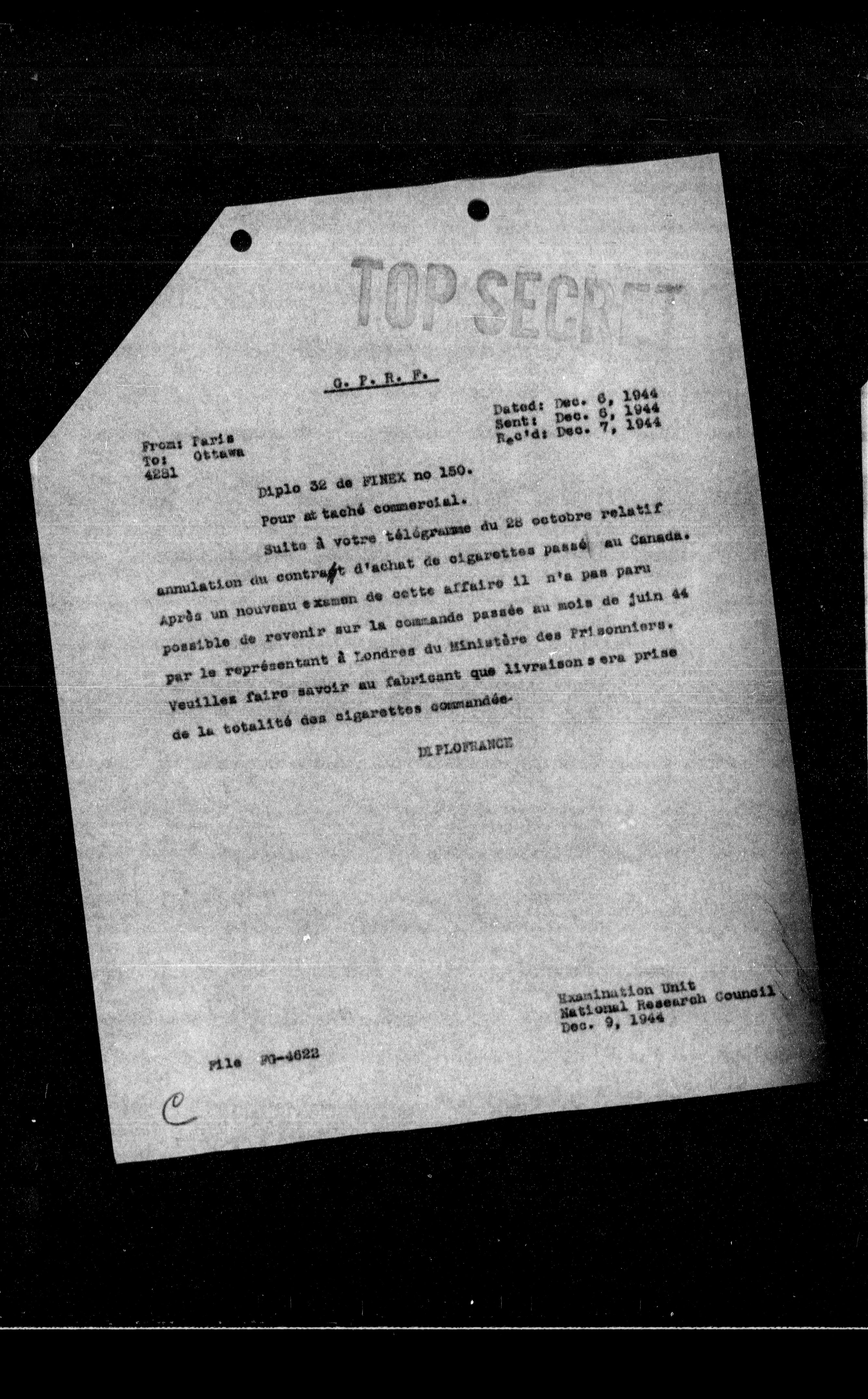 Suite à votre **télégraphe du 28 octobre relatif aux annuations du contrôle d'achat de cigarettes** passée au Canada. Après un nouveau examen de cette affaire il n'a pas paru possible de revenir sur la commande passée au mois de juin 44 par le représentant à Londres du Ministère des Prisonniers. Veuillez faire savoir au fabricant que livraisons une prise de la totalité des cigarettes commandées.