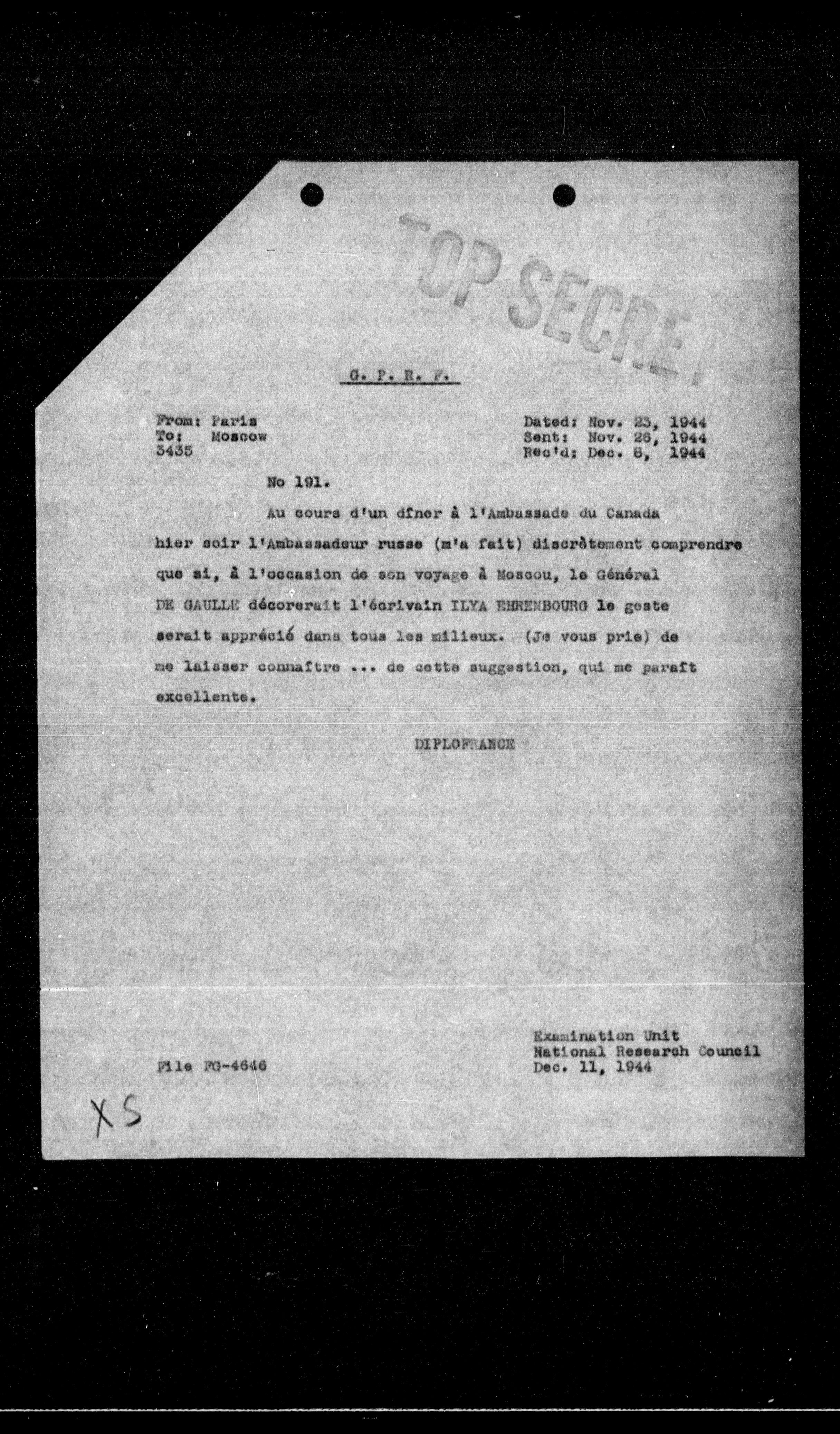 DE GAULLE décorerait l'écrivain ILYA HURENBOURG le geste serait apprécié dans tous les milieux. (Je vous prie) de me laisser connaitre ... de cette suggestion, qui me parait excellente.