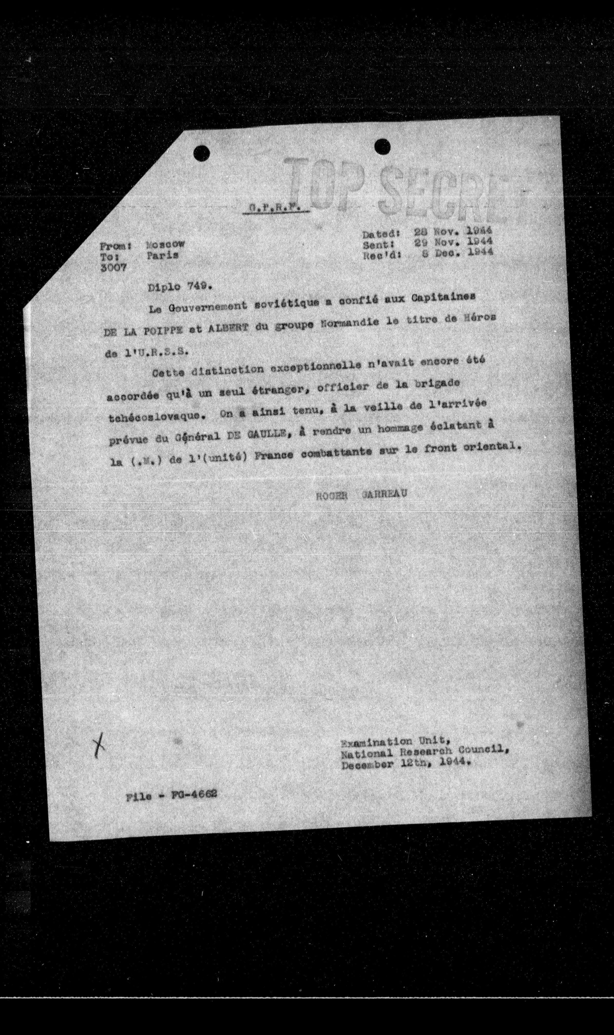 Le Gouvernement soviétique a confié aux Capitaines DE LA POIPPE et ALBERT du groupe Normandie le titre de héros de l'U.R.S.S.