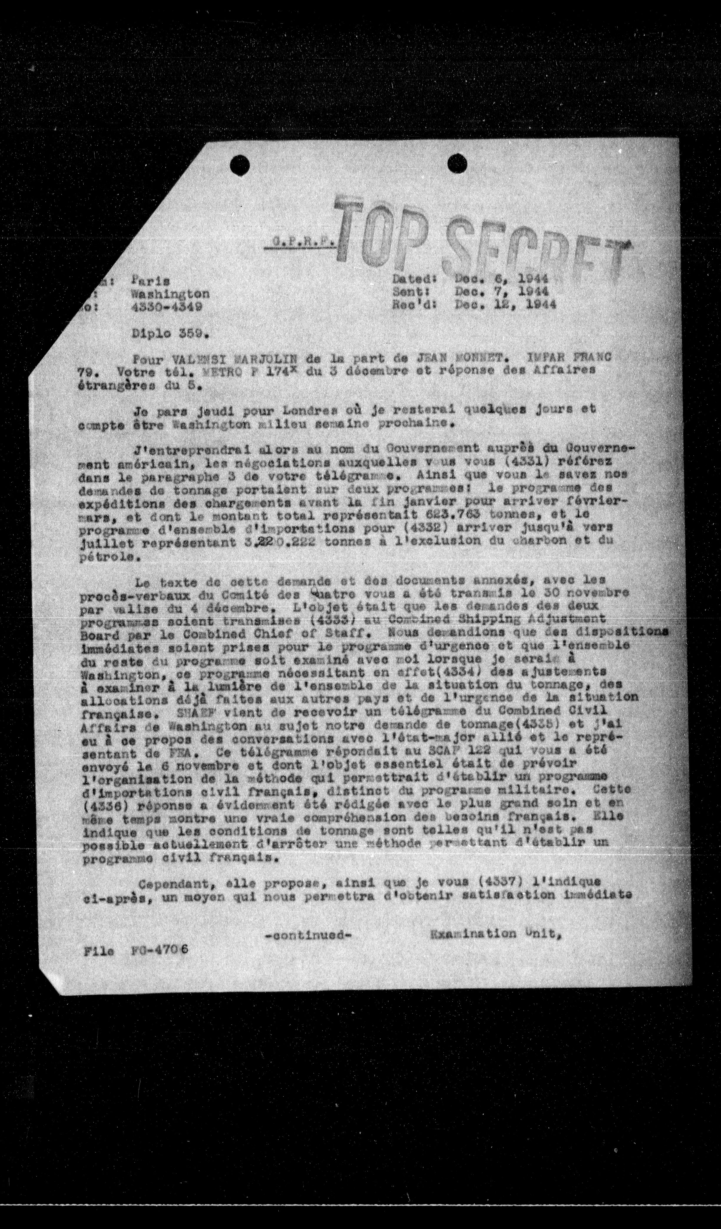 79. Votre tél. METRO P 174X du 3 décembre et réponse des Affaires