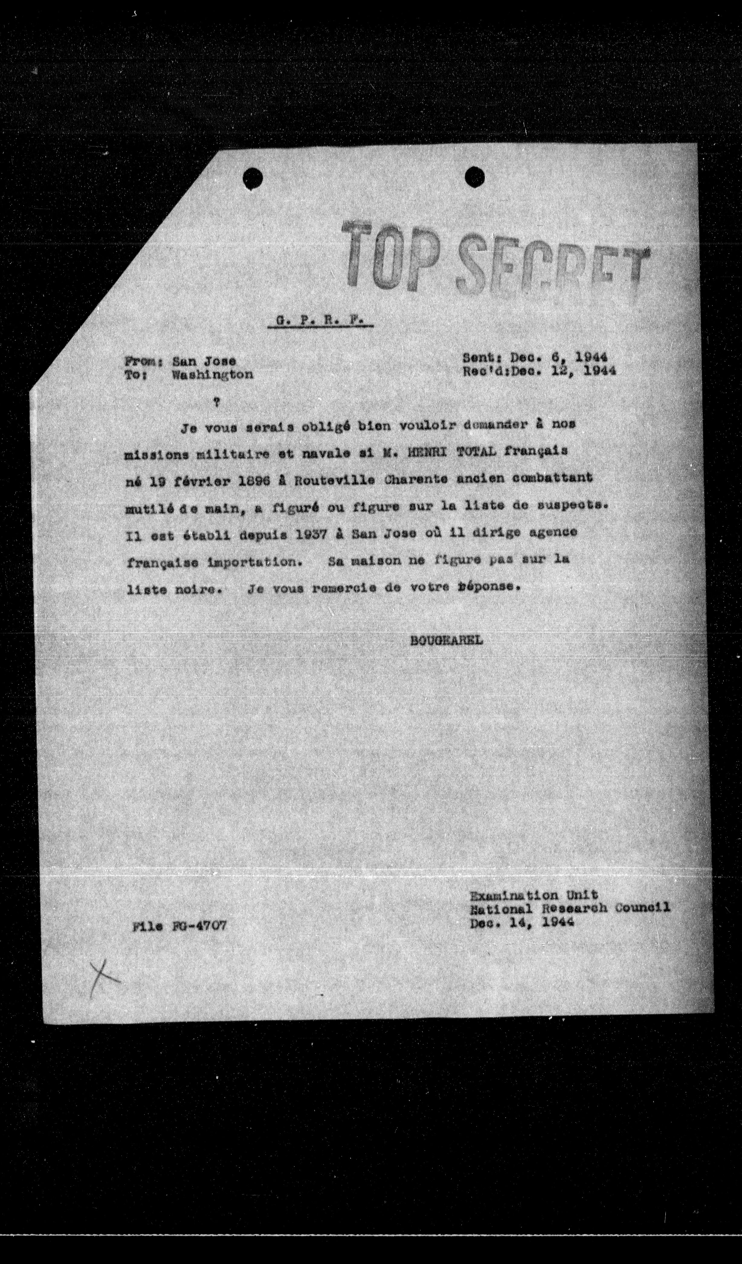 Je vous serais obligé bien vouloir demander à nos missions militaire et navale à M. HENRI TOTAL français né 19 février 1896 à Routeville Charente ancien combattant mutilé de main, a figuré ou figuré sur la liste de suspects. Il est établi depuis 1937 à San Jose où il dirige agence française importation. Sa maison ne figure pas sur la liste noire. Je vous remercie de votre réponse.