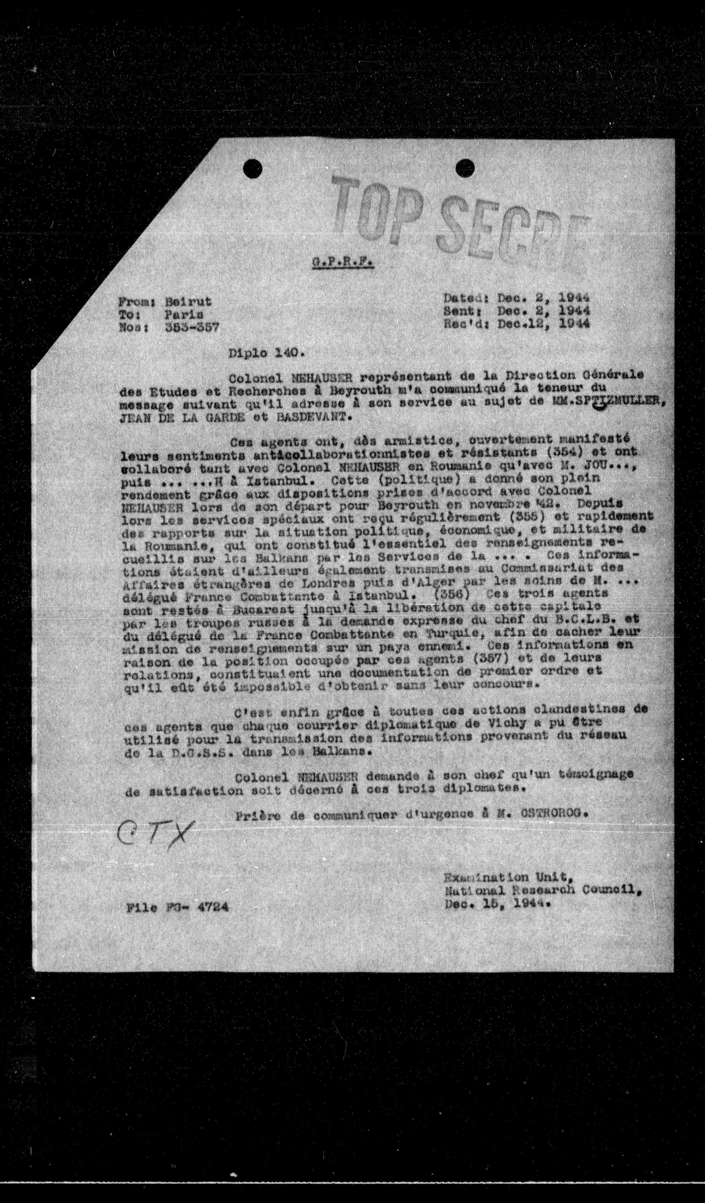 Ces agents ont, dès armistice, ouvertement manifesté leurs sentiments anticollaborationsistes et résistants (354) et ont collaboré tant avec Colonel NEHAUSER en Roumanie qu'avec M. JOU.... puis ... ... M. Istanbul. Cette (politique) a donné son plein rendement grâce aux dispositions prises d'accord avec Colonel NEHAUSER lors de son départ pour Beyrouth en novembre '68. Depuis lors les services spéciaux ont reçu régulièrement (355) et rapidement des rapports sur la situation politique, économique, et militaire de la Roumanie, qui ont constitué l'essentiel des renseignements recueillis sur les Balkans par les Services de la ... . Ces informations étaient d'ailleurs également transmises au Commissariat des Affaires étrangères de Londres puis d'Alger par les soins de M. ... délégué France Combattante à Istanbul. (356) Ces trois agents sont restés à Bucarest jusqu'à la libération de cette capitale par les troupes russes à la demande expresse du chef du B.C.L.B. et du délégué de la France Combattante en Turquie, afin de cacher leur mission de renseignements sur un pays ennemi. Ces informations en raison de la position occupée par ces agents (357) et de leurs relations, constituaient une documentation de premier ordre et qu'il eût été impossible d'obtenir sans leur concours.