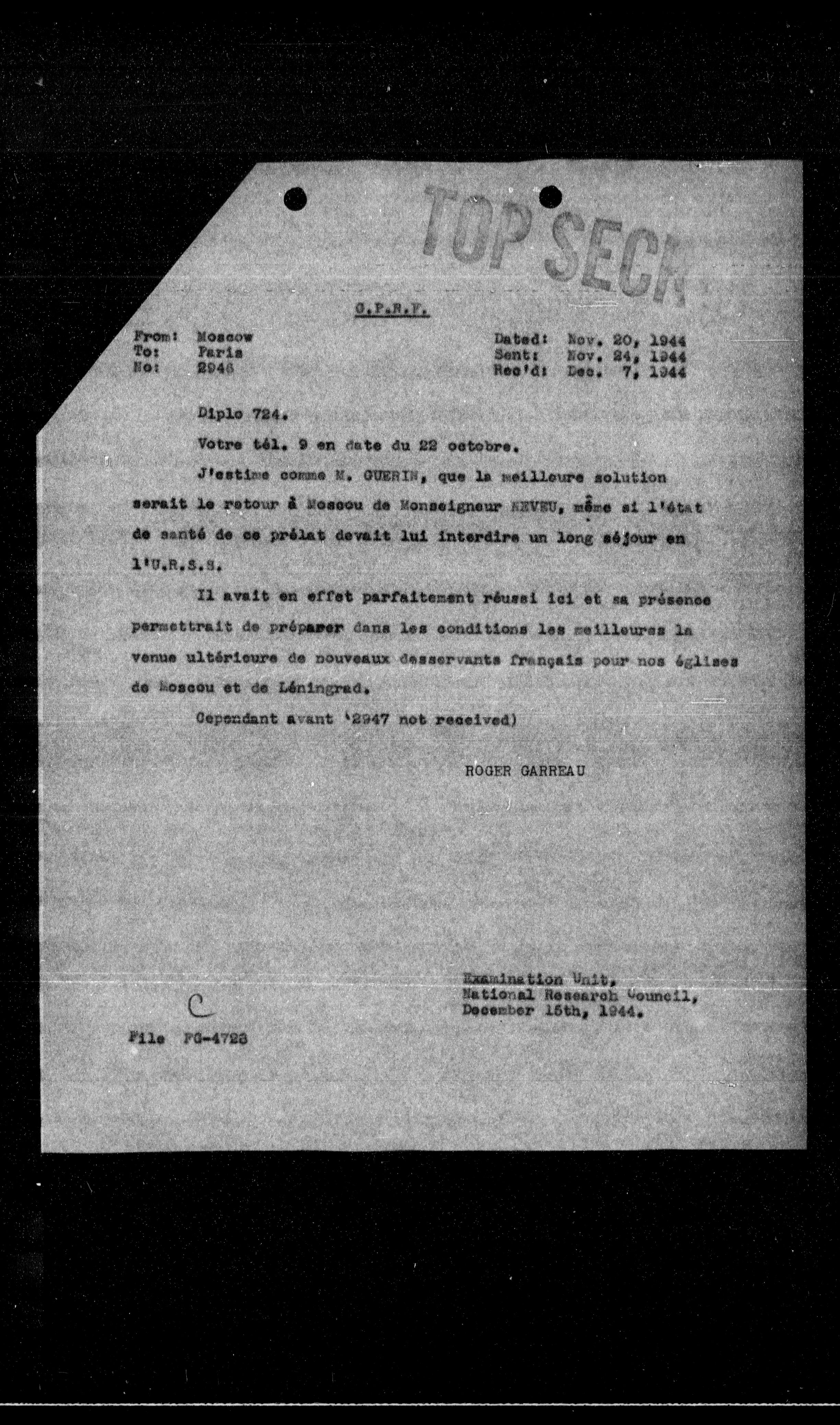 J'estime comme M. GUERIN, que la meilleure solution serait le retour à Moscou de Monseigneur KEVEU, même si l'état de santé de ce prélat devait lui interdire un long séjour en l'O.R.S.S.