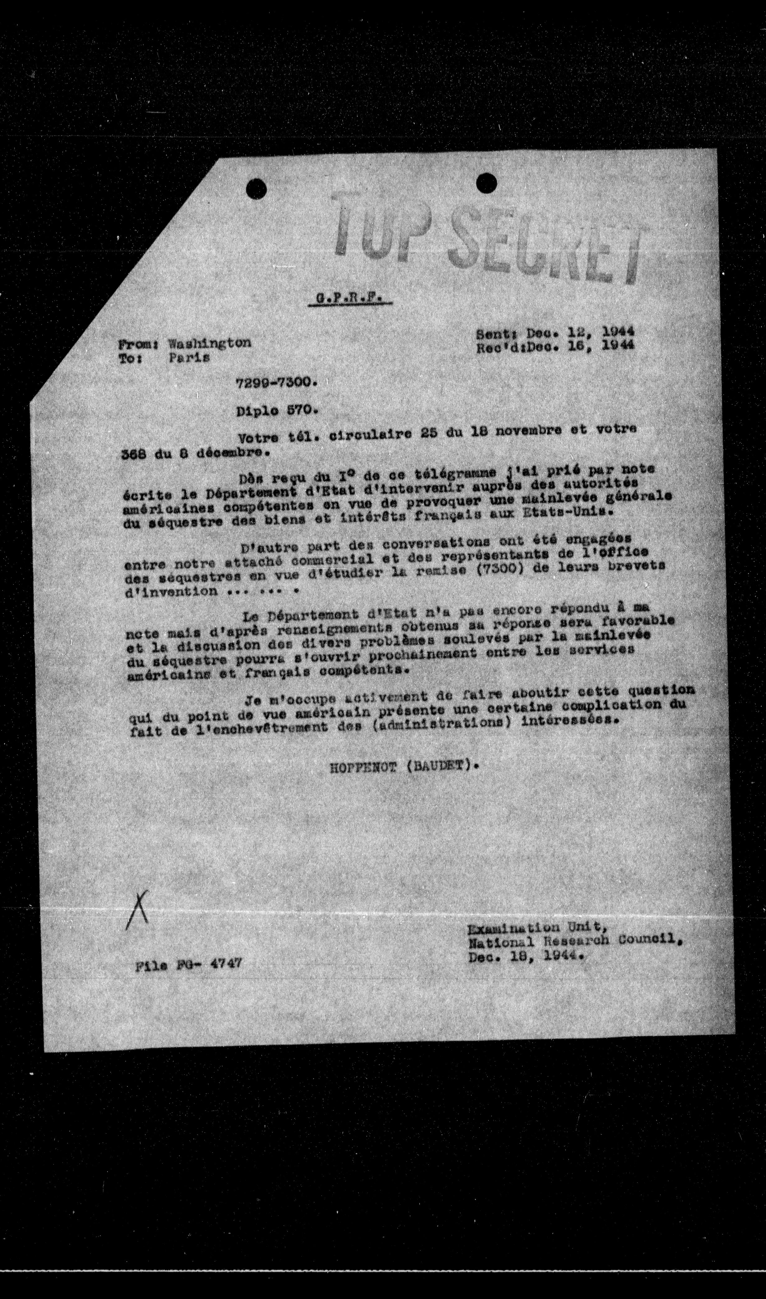 D'autre part des conversations ont été engagées entre notre attaché commercial et des représentants de l'office des séquestres en vue d'étudier la remise (7300) de leurs brevets d'invention.