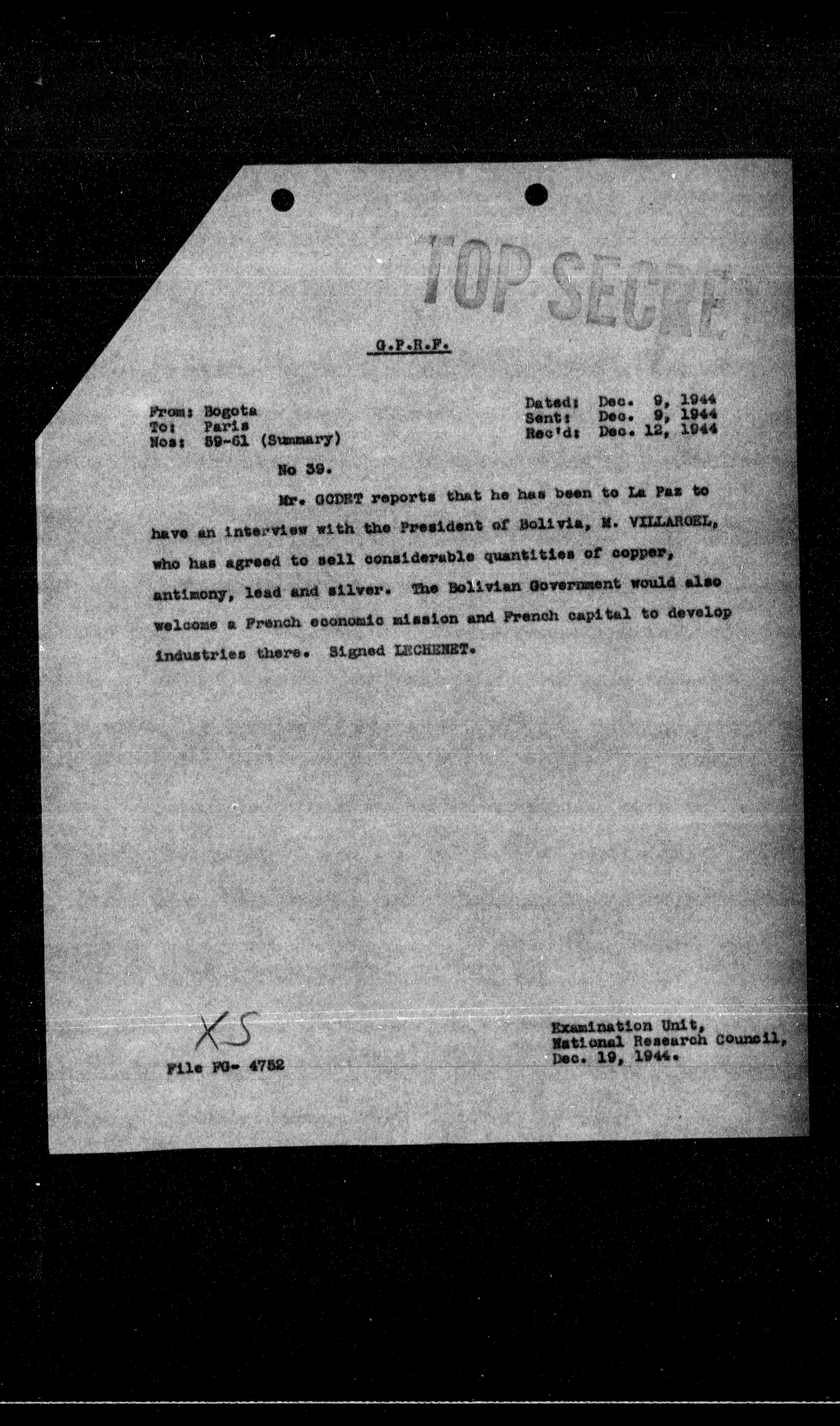Mr. GODET reports that he has been to La Paz to have an interview with the President of Bolivia, M. VILLAROSI, who has agreed to sell considerable quantities of copper, antimony, lead and silver. The Bolivian Government would also welcome a French economic mission and French capital to develop industries there. Signed LECHENET.
