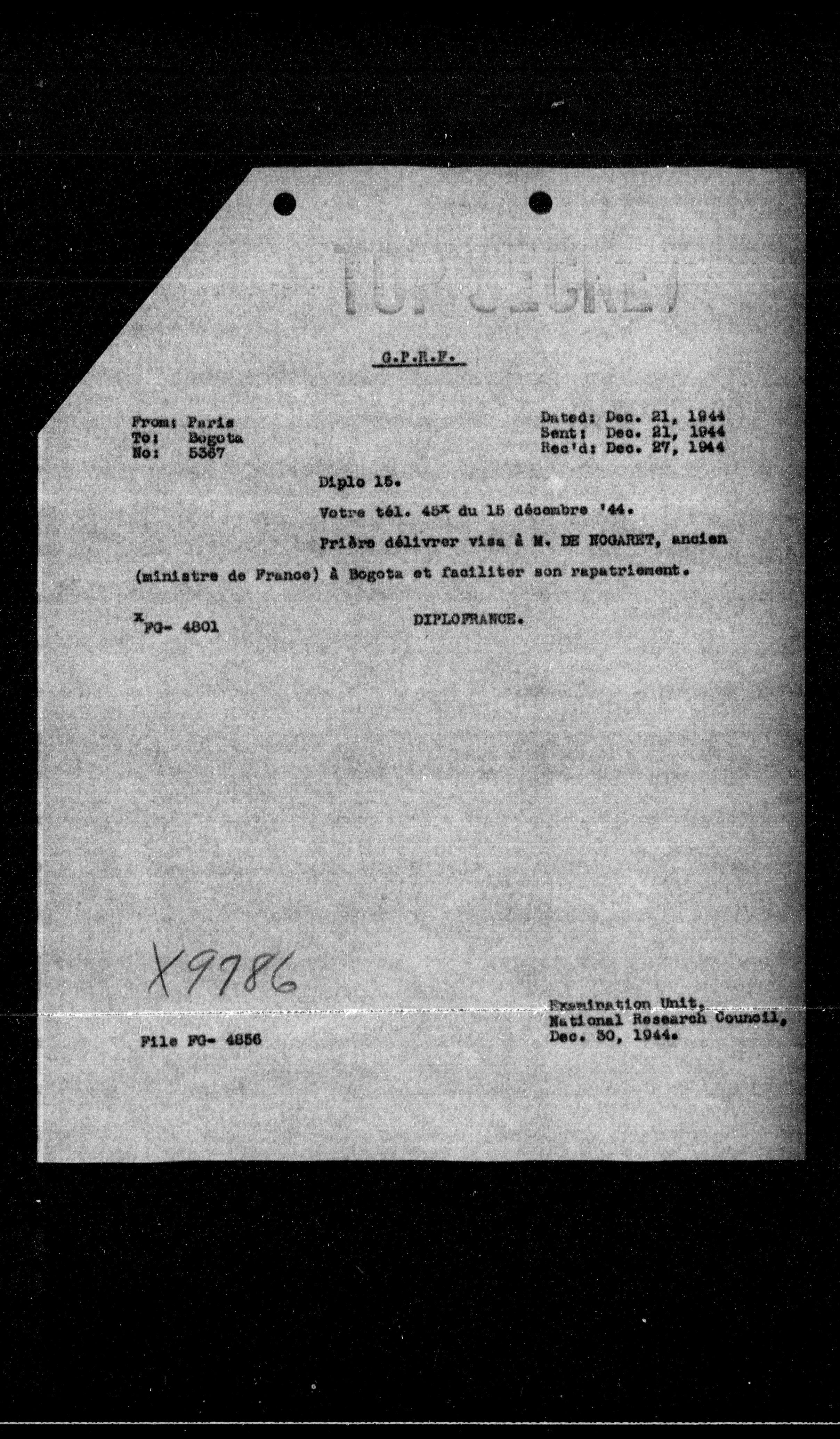 **From:** Paris **To:** **Bugeta** **No:** 5367 **Date:** Dec. 21, 1944 **Sent:** Dec. 21, 1944 **Reel:** Dec. 27, 1944