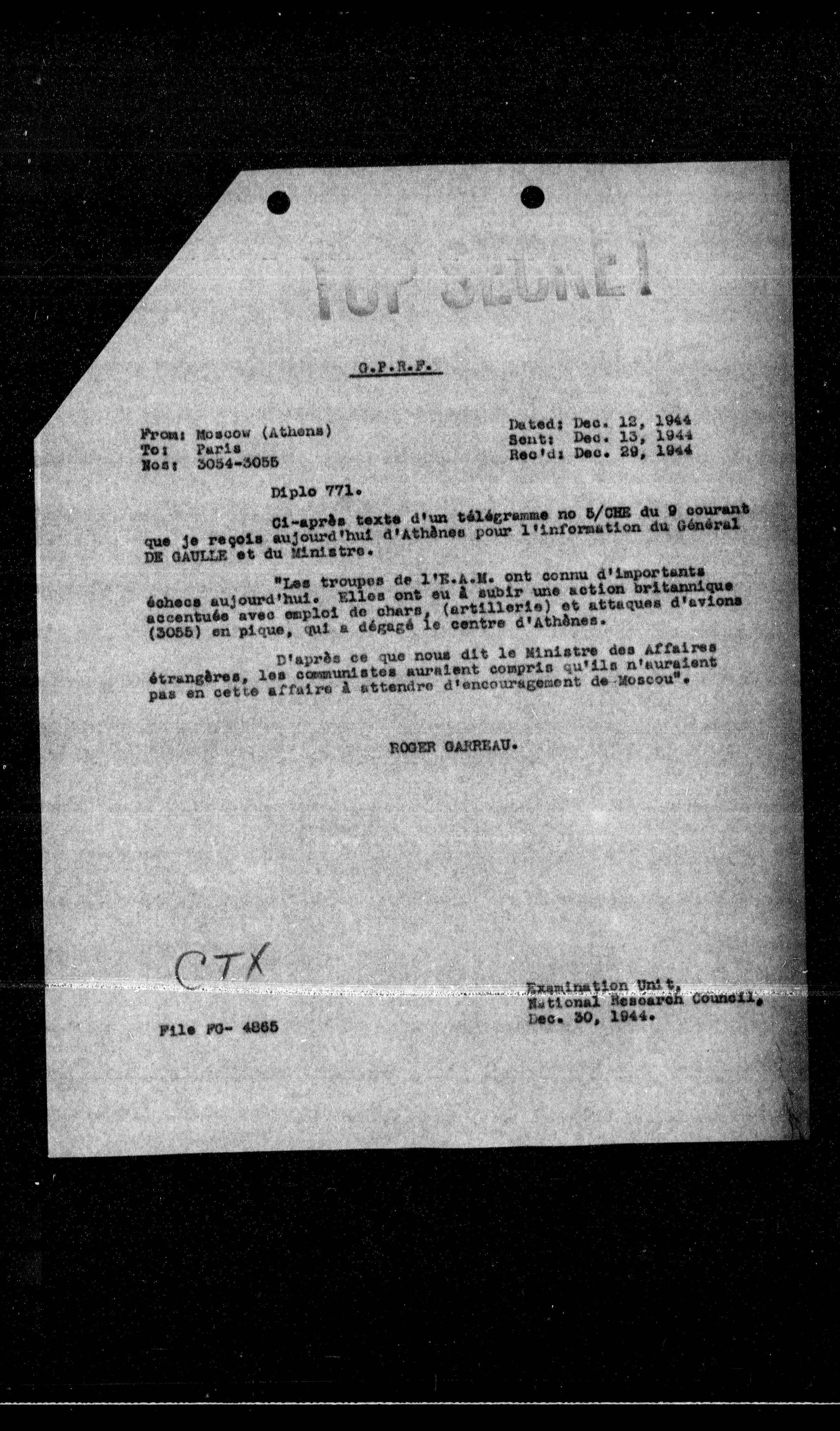 Ci-après texto d'un t414grame no 5/CNE du 9 courant que je reçois aujourd'hui d'Athènes pour l'infornation du Général DE GAULLE et du Ministre.